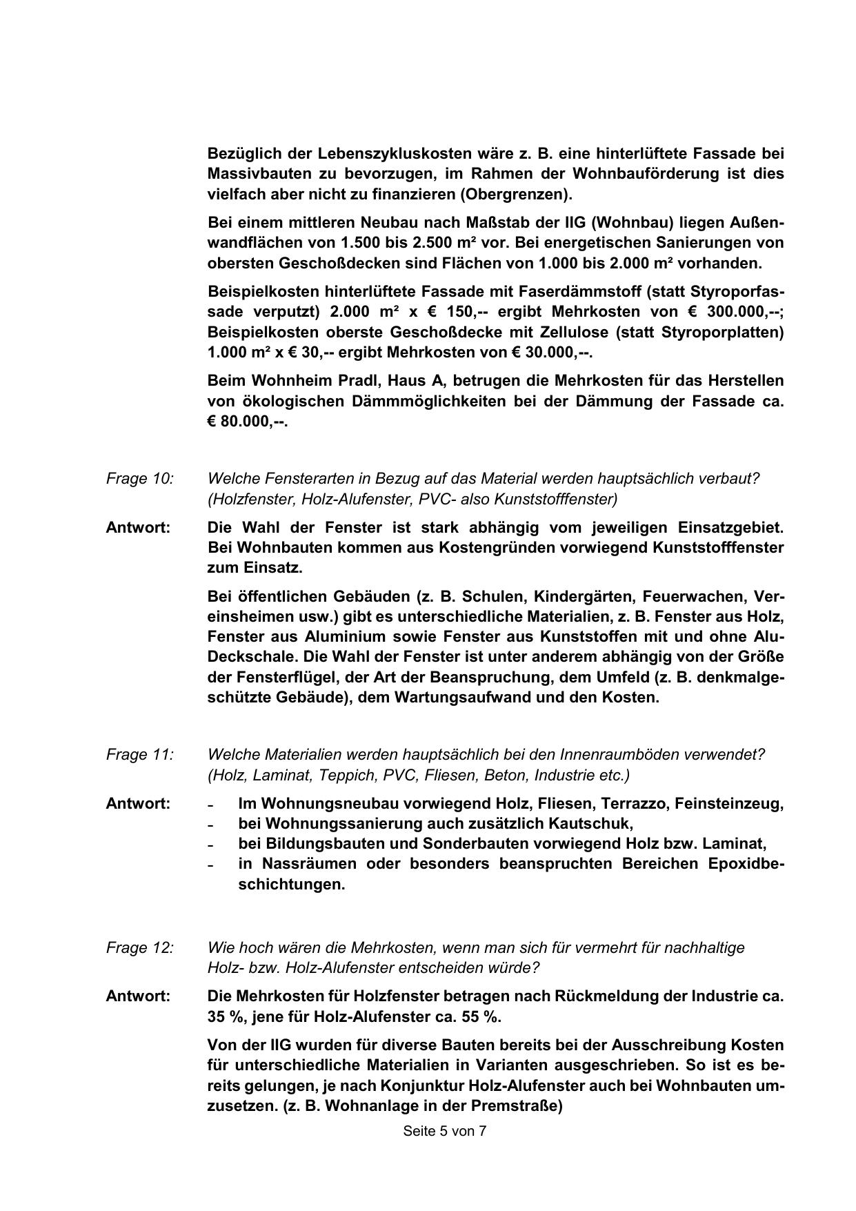 für unterschiedliche Materialien in Varianten ausgeschrieben. So ist es bereits gelungen, je nach Konjunktur Holz-Alufenster auch bei Wohnbauten umzusetzen. (z. B. Wohnanlage in der Premstraße)