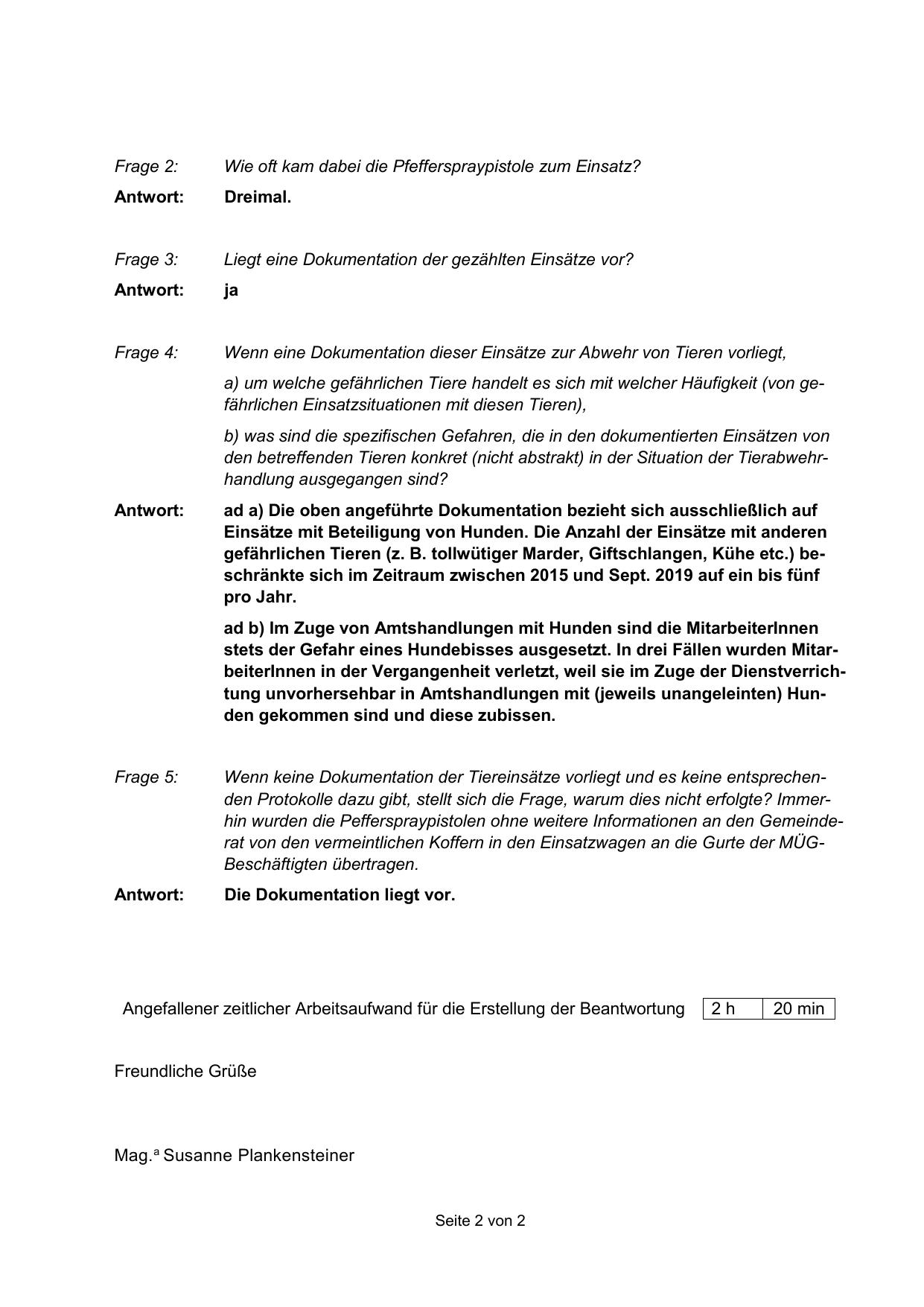 Wenn keine Dokumentation der Tiereinsätze vorliegt und es keine entsprechenden Protokolle dazu gibt, stellt sich die Frage, warum dies nicht erfolgte? Immerhin wurden die Pefferspraypistolen ohne weitere Informationen an den Gemeinderat von den vermeintlichen Koffern in den Einsatzwagen an die Gurte der MÜGBeschäftigten übertragen.