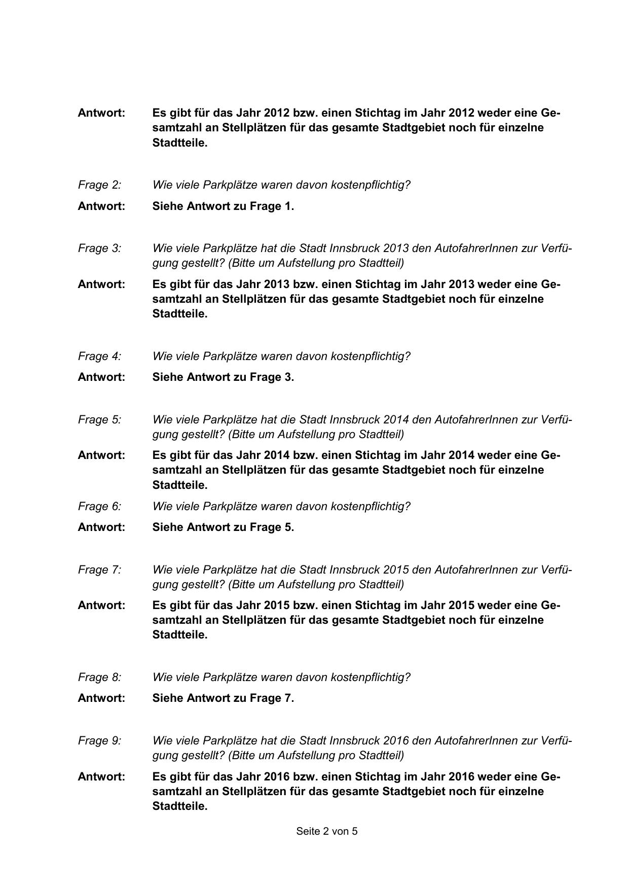 Wie viele Parkplätze hat die Stadt Innsbruck 2016 den AutofahrerInnen zur Verfügung gestellt? (Bitte um Aufstellung pro Stadtteil)