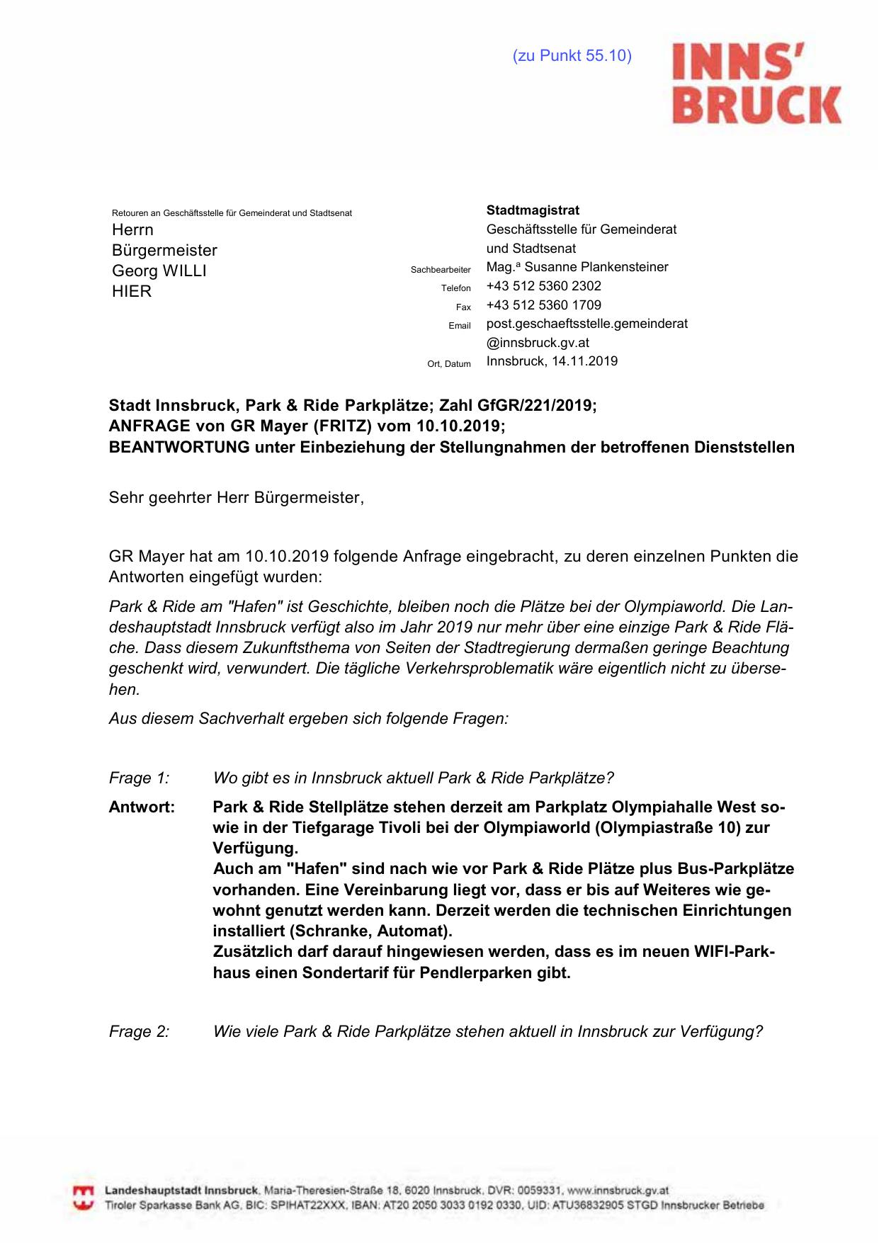 Stadt Innsbruck, Park & Ride Parkplätze; Zahl GfGR/221/2019;