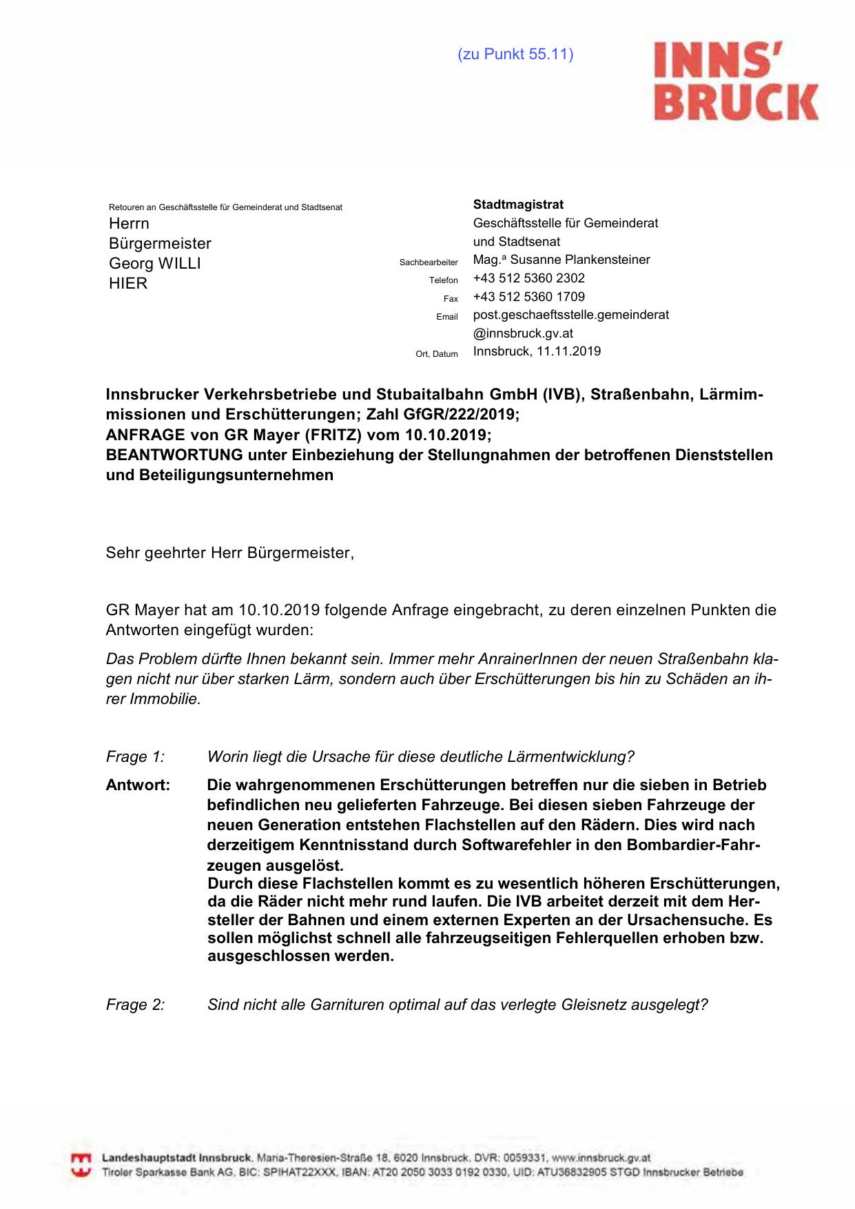 Innsbrucker Verkehrsbetriebe und Stubaitalbahn GmbH (IVB), Straßenbahn, Lärmimmissionen und Erschütterungen; Zahl GfGR/222/2019;