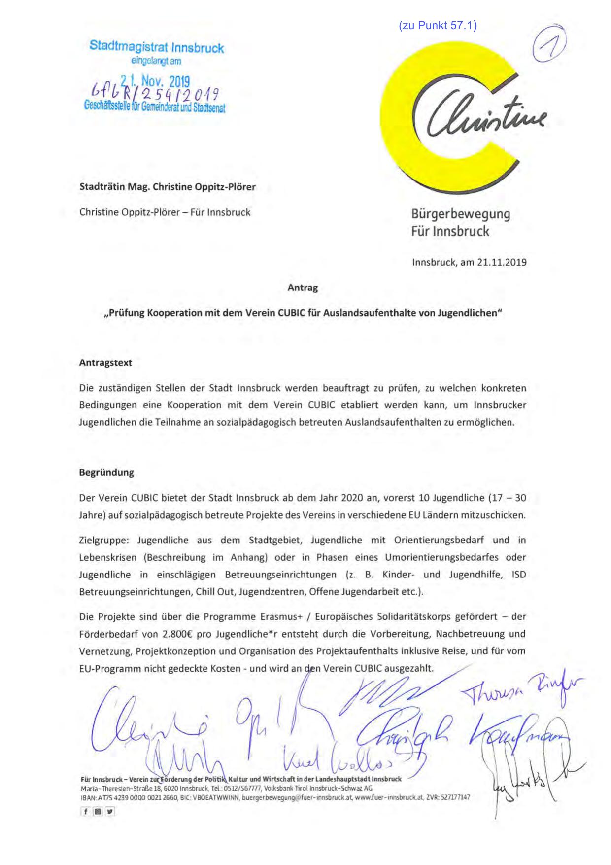 Der Verein CUBIC bietet der Stadt Innsbruck ab dem Jahr 2020 an, vorerst 10 Jugendliche (17 - 30