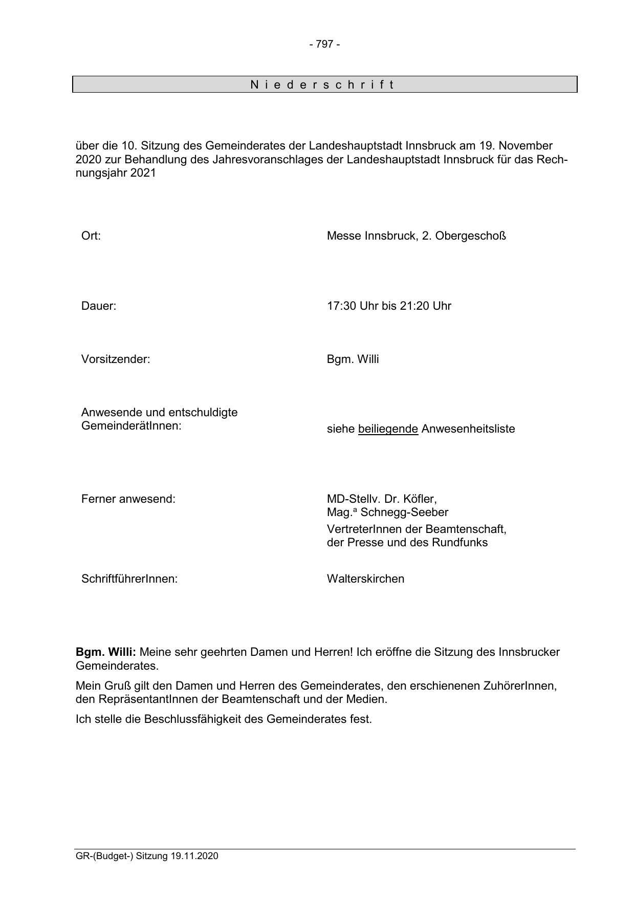 Bgm. Willi: Meine sehr geehrten Damen und Herren! Ich eröffne die Sitzung des Innsbrucker
