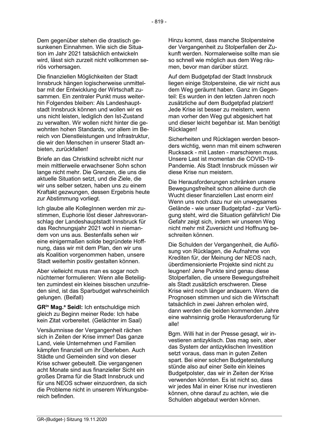 Ich glaube alle KollegInnen werden mir zustimmen, Euphorie löst dieser Jahresvoranschlag der Landeshauptstadt Innsbruck für
