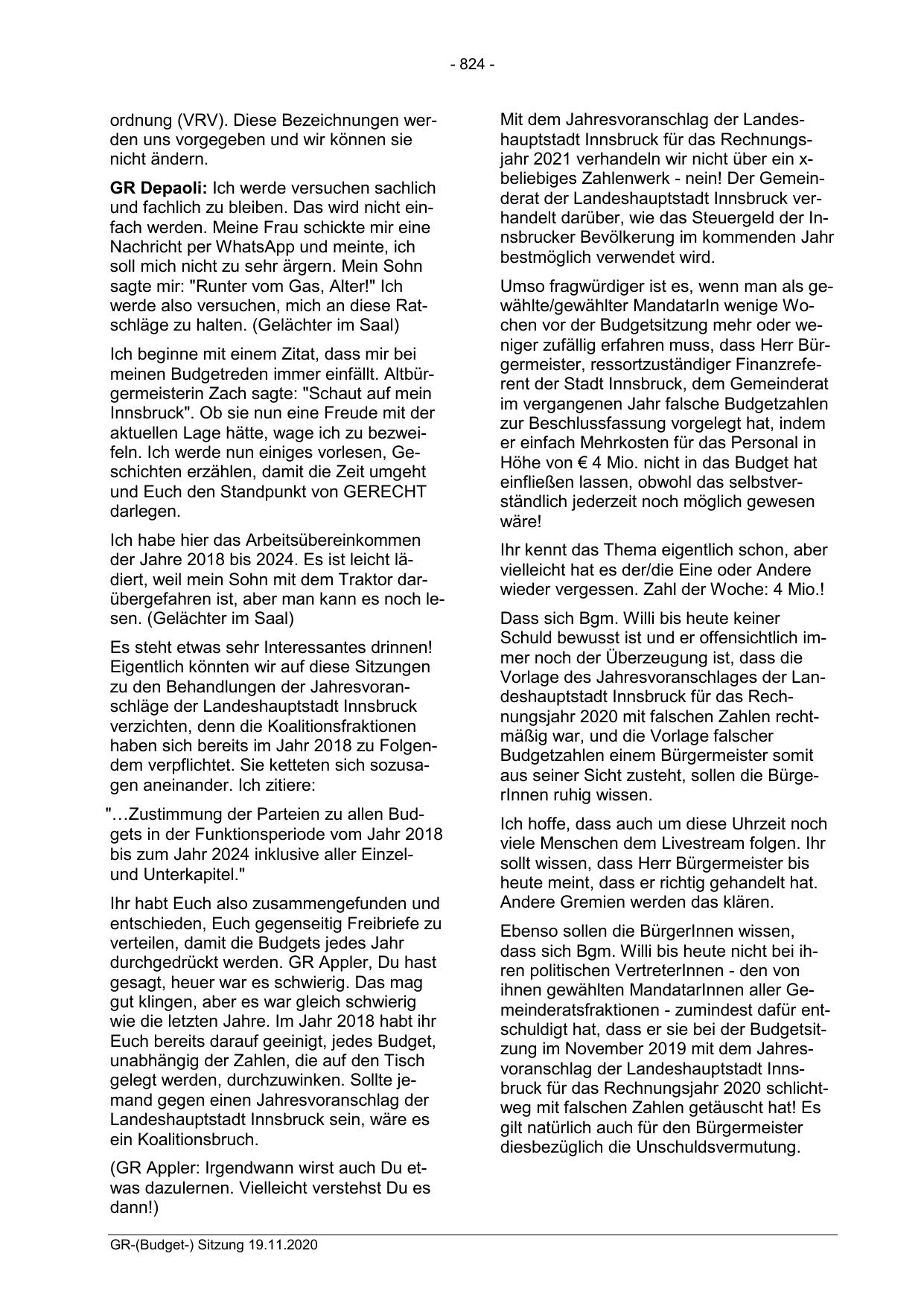 ihnen gewählten MandatarInnen aller Gemeinderatsfraktionen - zumindest dafür entschuldigt hat, dass er sie bei der Budgetsitzung im November 2019 mit dem Jahresvoranschlag der Landeshauptstadt Innsbruck für das Rechnungsjahr 2020 schlichtweg mit falschen Zahlen getäuscht hat! Es