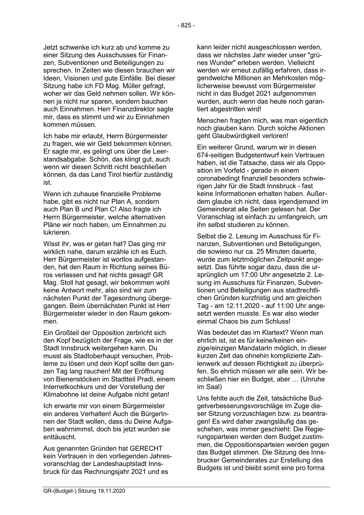kein Vertrauen in den vorliegenden Jahresvoranschlag der Landeshauptstadt Innsbruck für das Rechnungsjahr 2021 und es