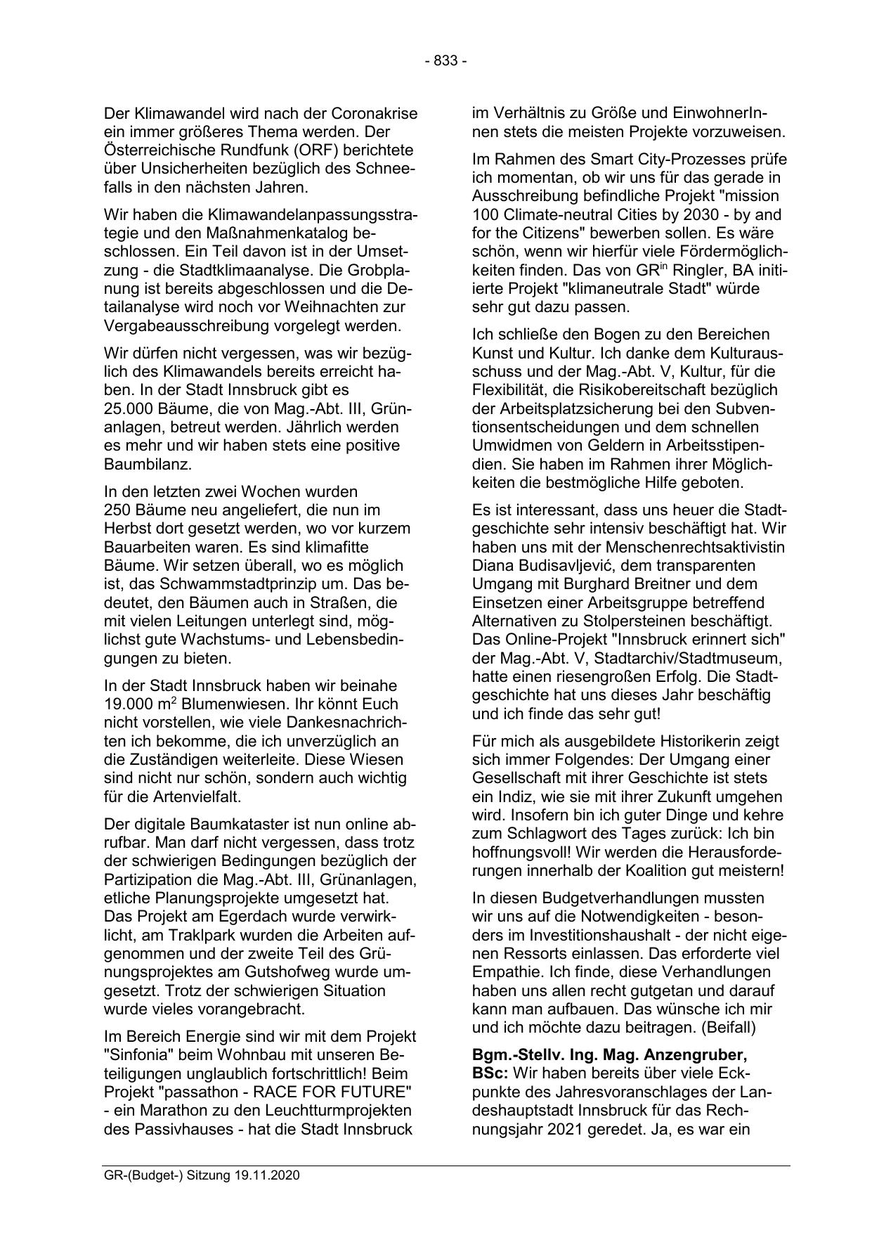 BSc: Wir haben bereits über viele Eckpunkte des Jahresvoranschlages der Landeshauptstadt Innsbruck für das Rechnungsjahr 2021 geredet. Ja, es war ein