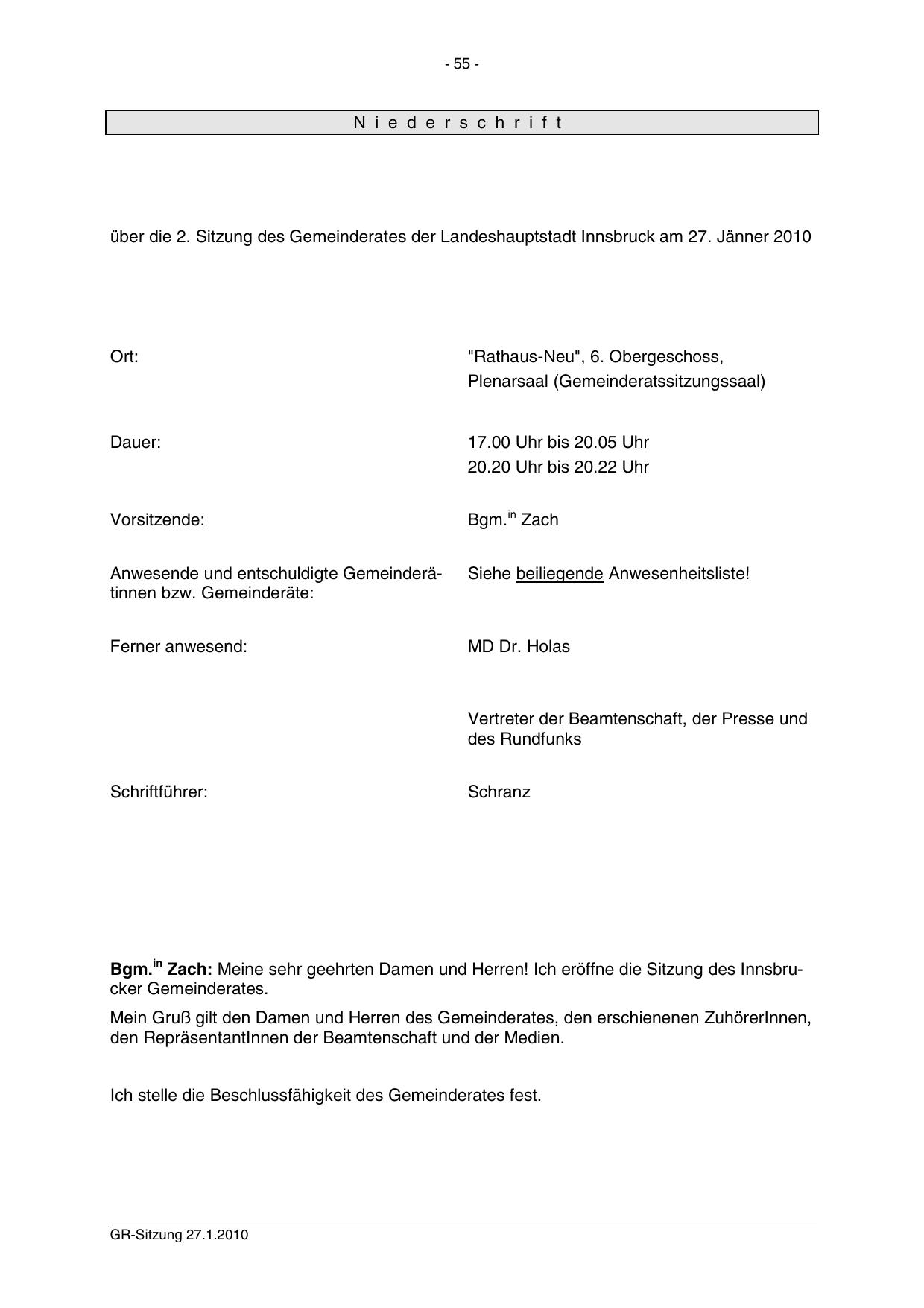 Bgm.in Zach: Meine sehr geehrten Damen und Herren! Ich eröffne die Sitzung des Innsbrucker Gemeinderates.