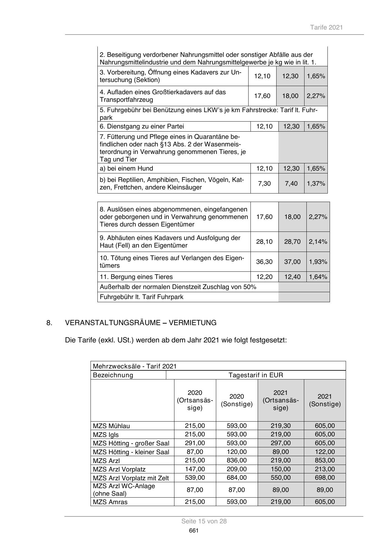 Die Tarife (exkl. USt.) werden ab dem Jahr 2021 wie folgt festgesetzt: