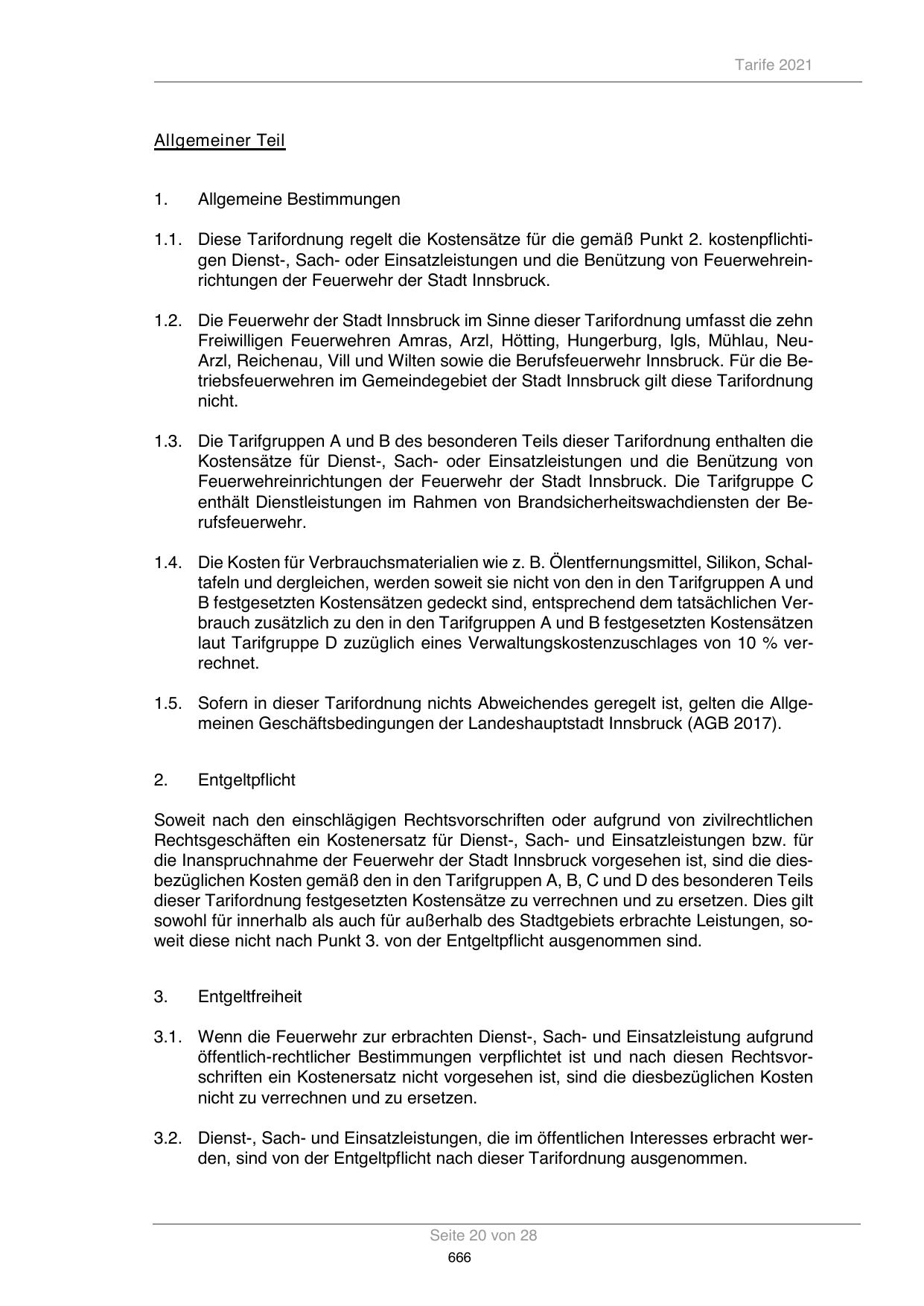 1.1. Diese Tarifordnung regelt die Kostensätze für die gemäß Punkt 2. kostenpflichtigen Dienst-, Sach- oder Einsatzleistungen und die Benützung von Feuerwehreinrichtungen der Feuerwehr der Stadt Innsbruck.