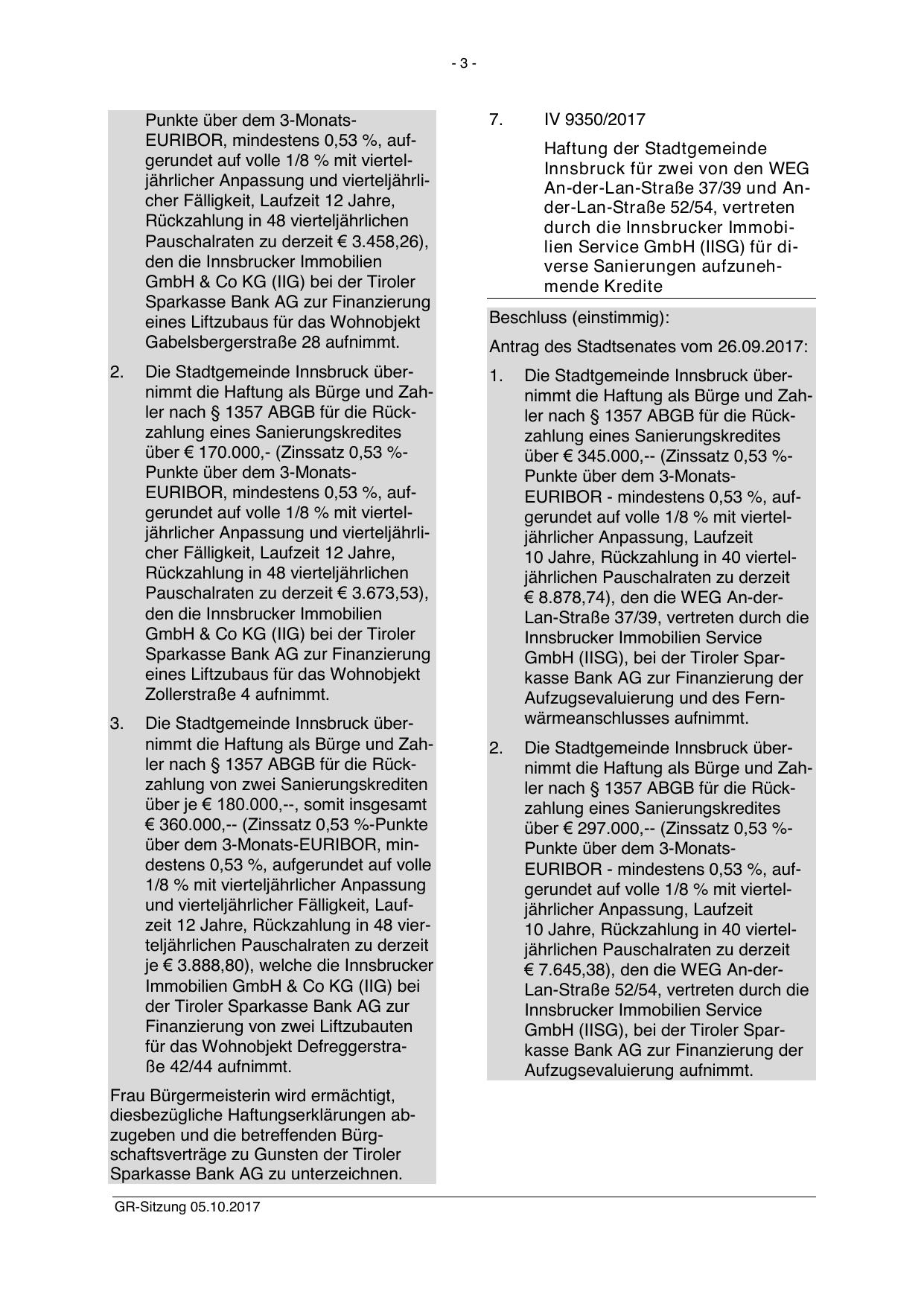 durch die Innsbrucker Immobilien Service GmbH (IISG) für diverse Sanierungen aufzunehmende Kredite