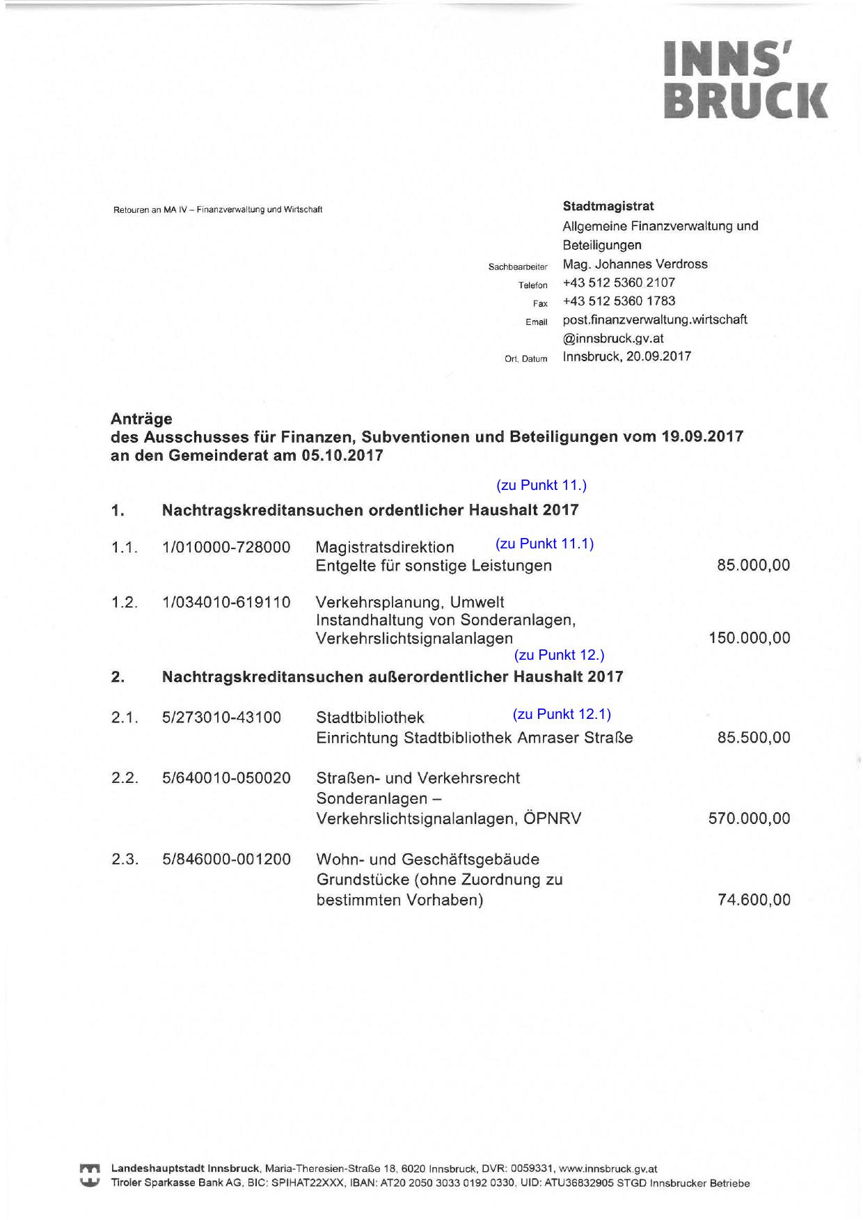 Nachtragskreditansuchen außerordentlicher Haushalt 2017
