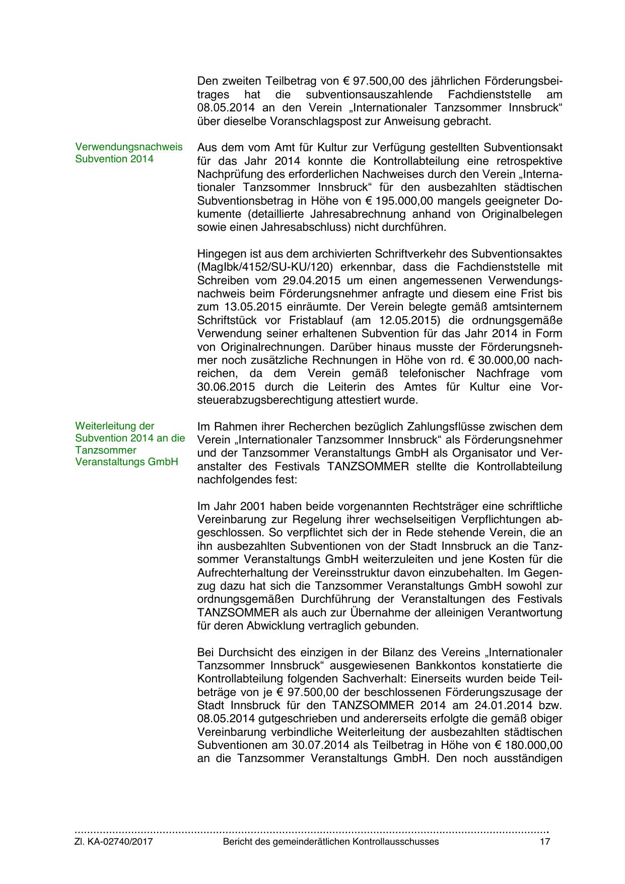 Nachprüfung des erforderlichen Nachweises durch den Verein „Internationaler Tanzsommer Innsbruck“ für den ausbezahlten städtischen