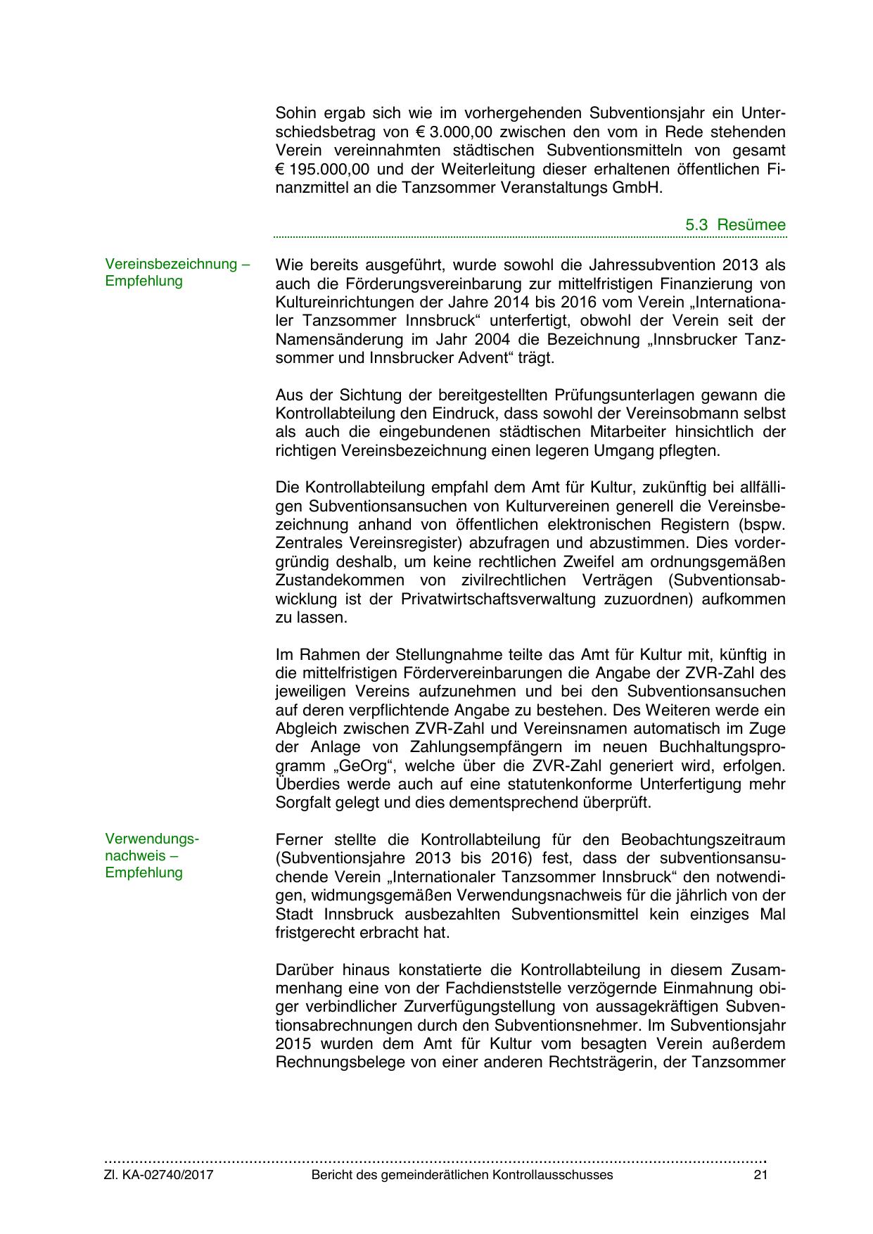 (Subventionsjahre 2013 bis 2016) fest, dass der subventionsansuchende Verein „Internationaler Tanzsommer Innsbruck“ den notwendigen, widmungsgemäßen Verwendungsnachweis für die jährlich von der