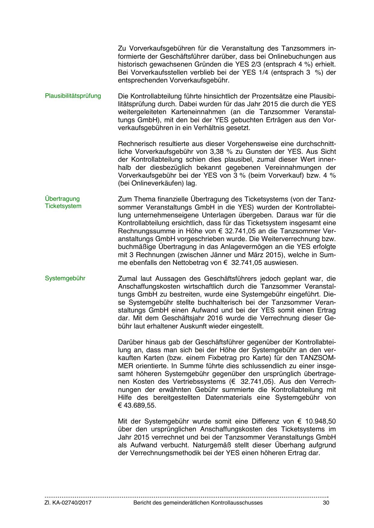 Zum Thema finanzielle Übertragung des Ticketsystems (von der Tanzsommer Veranstaltungs GmbH in die YES) wurden der Kontrollabteilung unternehmenseigene Unterlagen übergeben. Daraus war für die