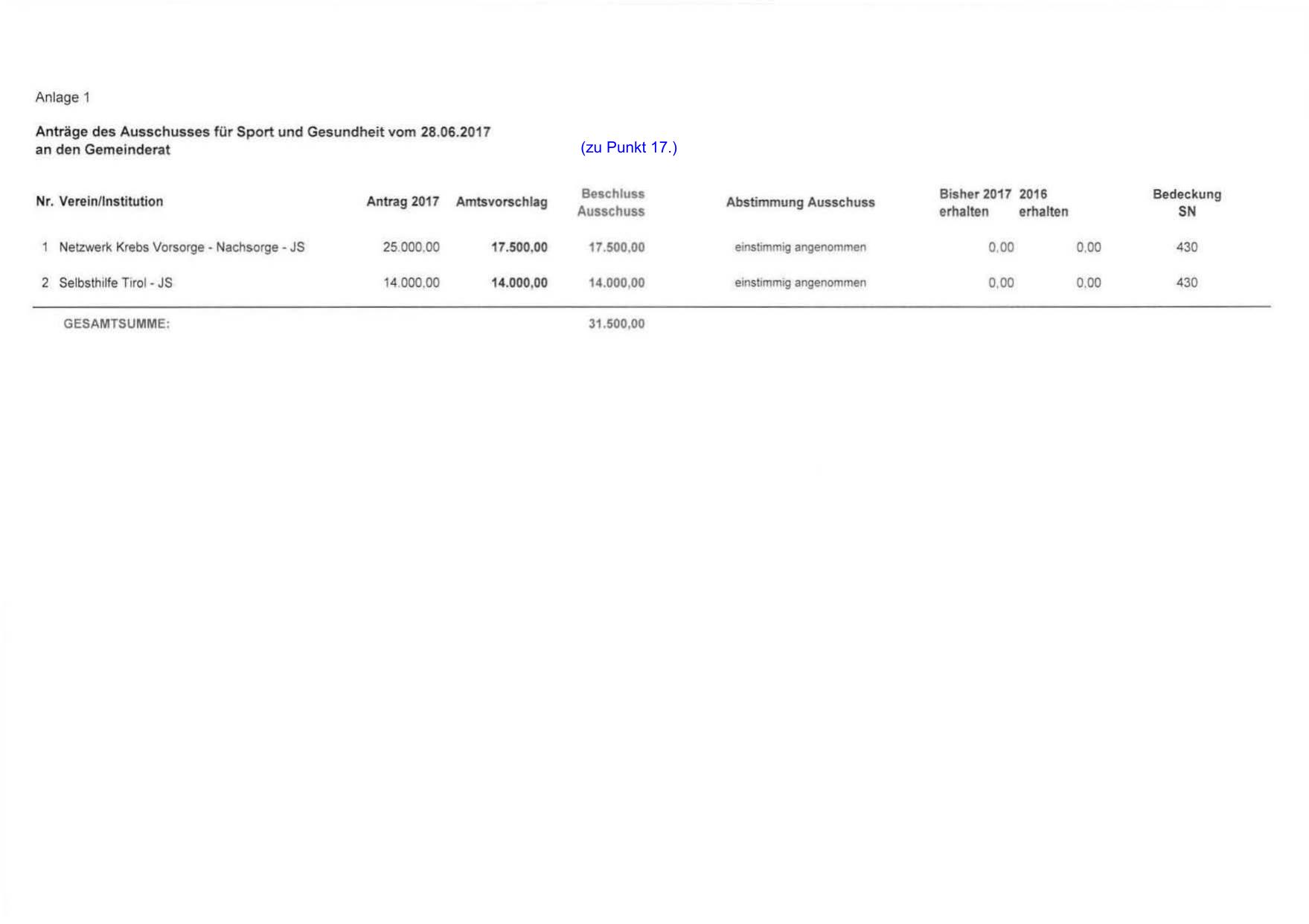 Anträge des Ausschusses für Sport und Gesundheit vom 28.06.2017