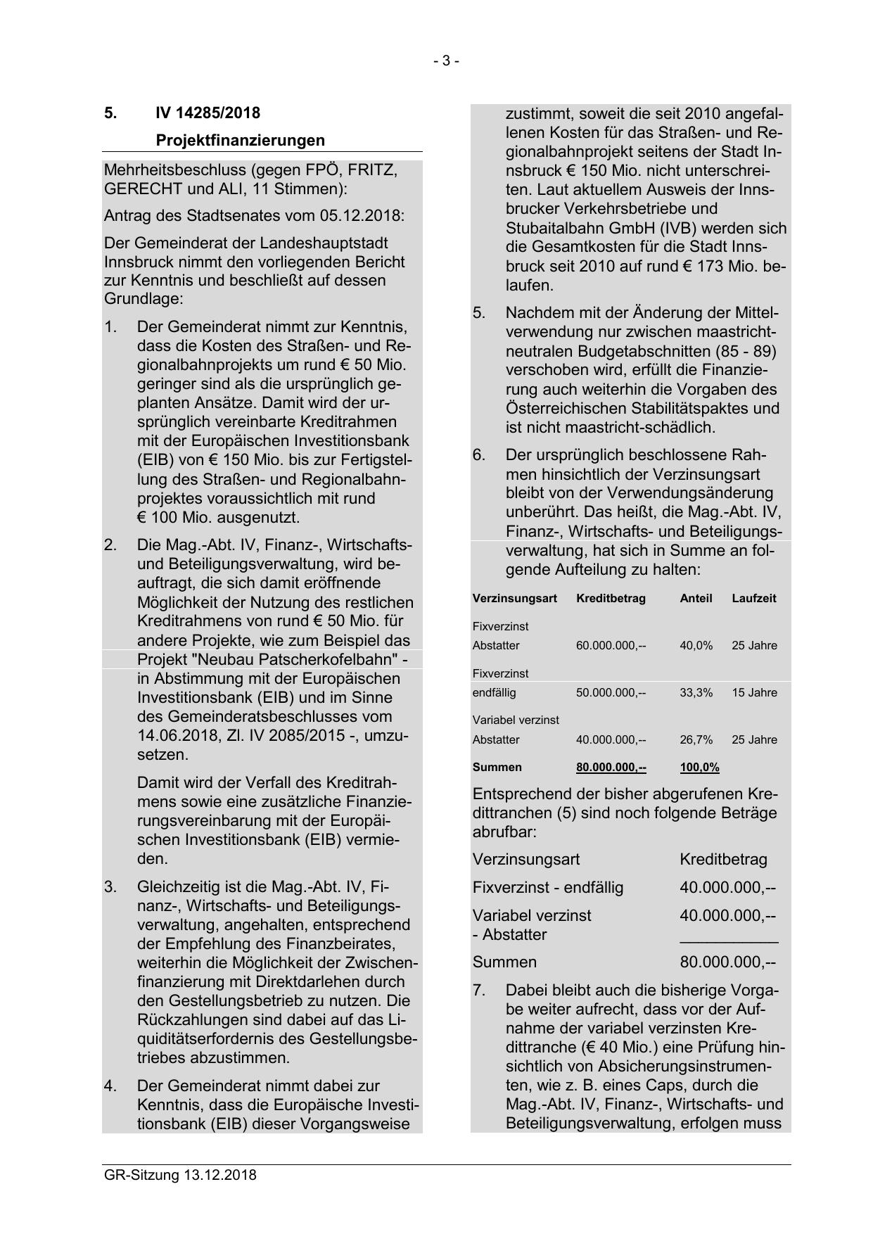 zustimmt, soweit die seit 2010 angefallenen Kosten für das Straßen- und Regionalbahnprojekt seitens der Stadt Innsbruck € 150 Mio. nicht unterschreiten. Laut aktuellem Ausweis der Innsbrucker Verkehrsbetriebe und