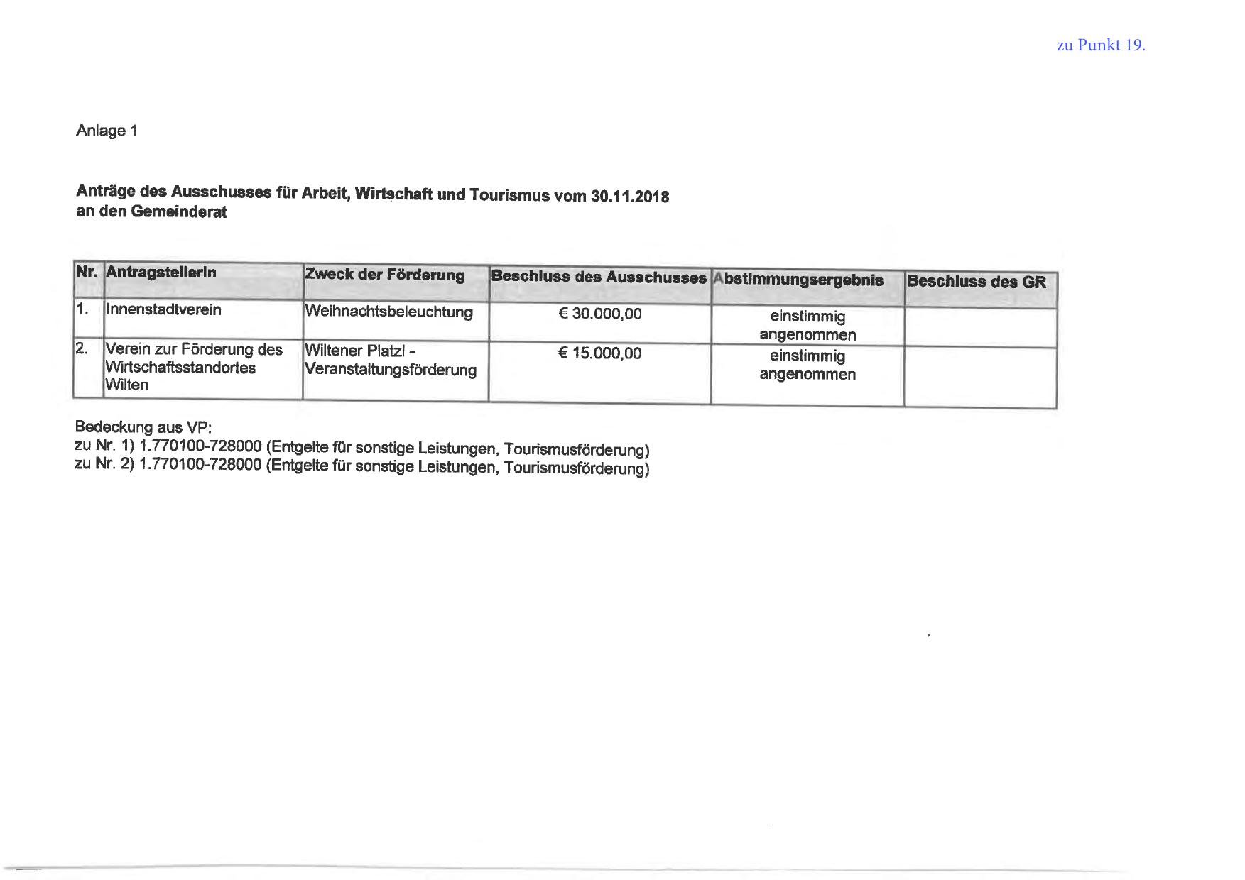 Anträge des Ausschusses für Arbeit, Wirtschaft und Tourismus vom 30.11.2018