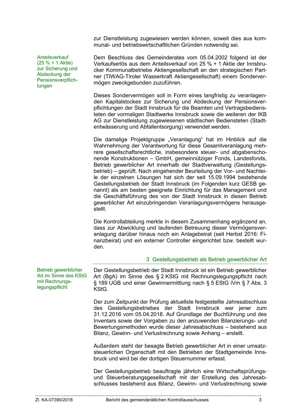 Dieses Sondervermögen soll in Form eines langfristig zu veranlagenden Kapitalstockes zur Sicherung und Abdeckung der Pensionsverpflichtungen der Stadt Innsbruck für die Beamten und Vertragsbediensteten der vormaligen Stadtwerke Innsbruck sowie die weiteren der IKB