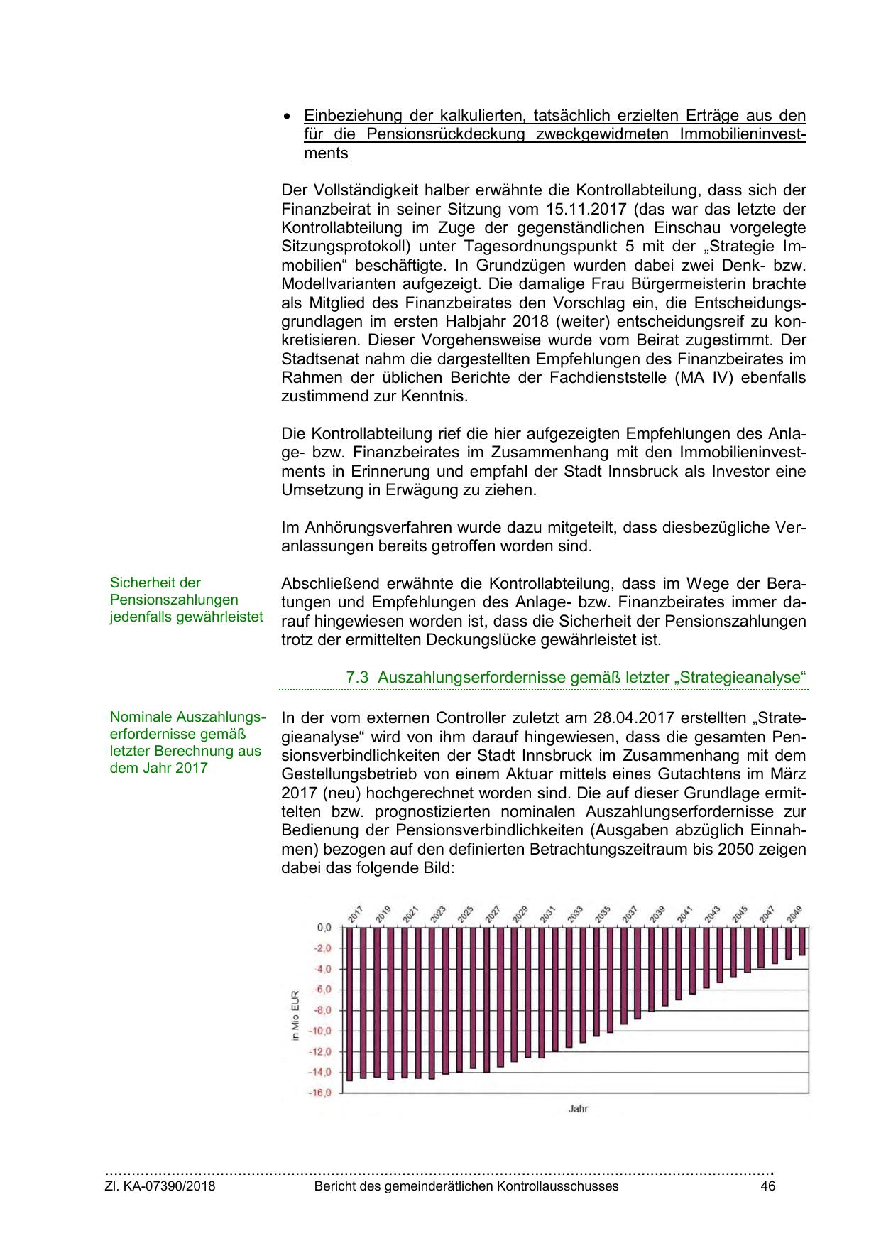 In der vom externen Controller zuletzt am 28.04.2017 erstellten „Strategieanalyse“ wird von ihm darauf hingewiesen, dass die gesamten Pensionsverbindlichkeiten der Stadt Innsbruck im Zusammenhang mit dem