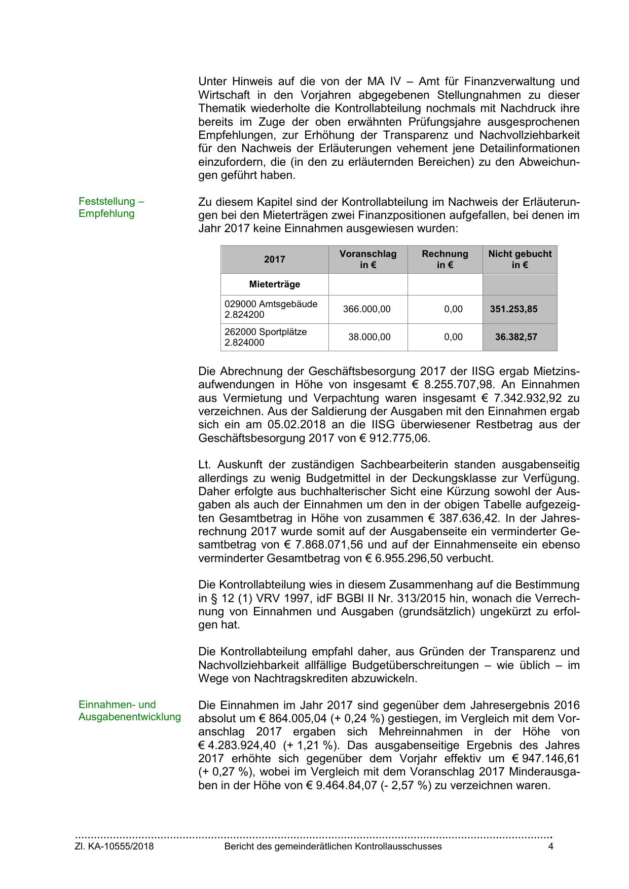Die Abrechnung der Geschäftsbesorgung 2017 der IISG ergab Mietzinsaufwendungen in Höhe von insgesamt € 8.255.707,98. An Einnahmen