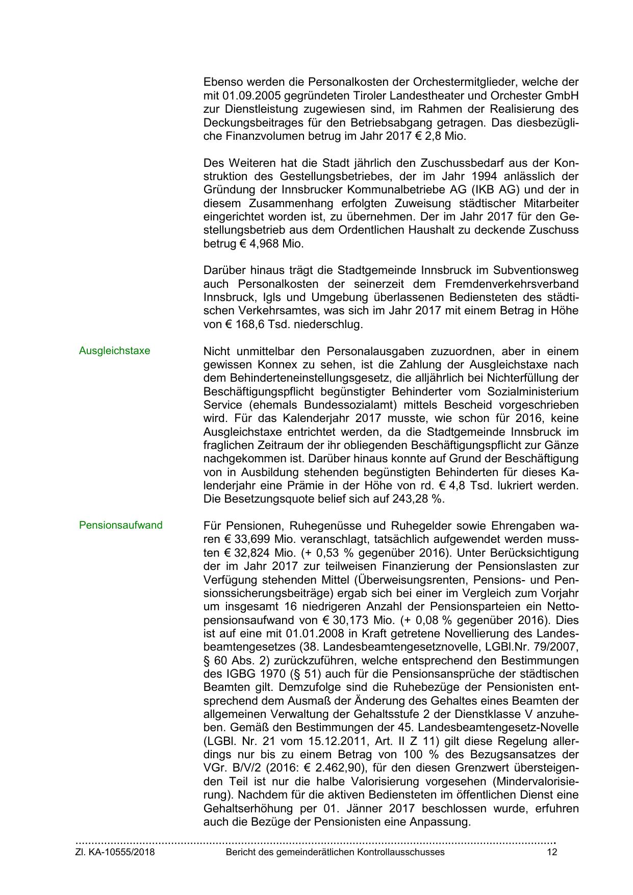 Für Pensionen, Ruhegenüsse und Ruhegelder sowie Ehrengaben waren € 33,699 Mio. veranschlagt, tatsächlich aufgewendet werden mussten € 32,824 Mio. (+ 0,53 % gegenüber 2016). Unter Berücksichtigung
