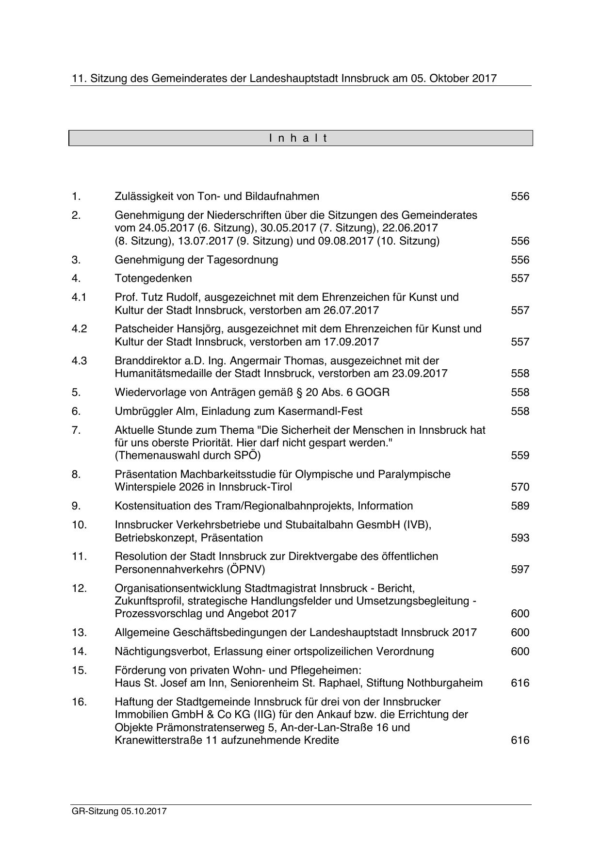 11. Sitzung des Gemeinderates der Landeshauptstadt Innsbruck am 05. Oktober 2017
