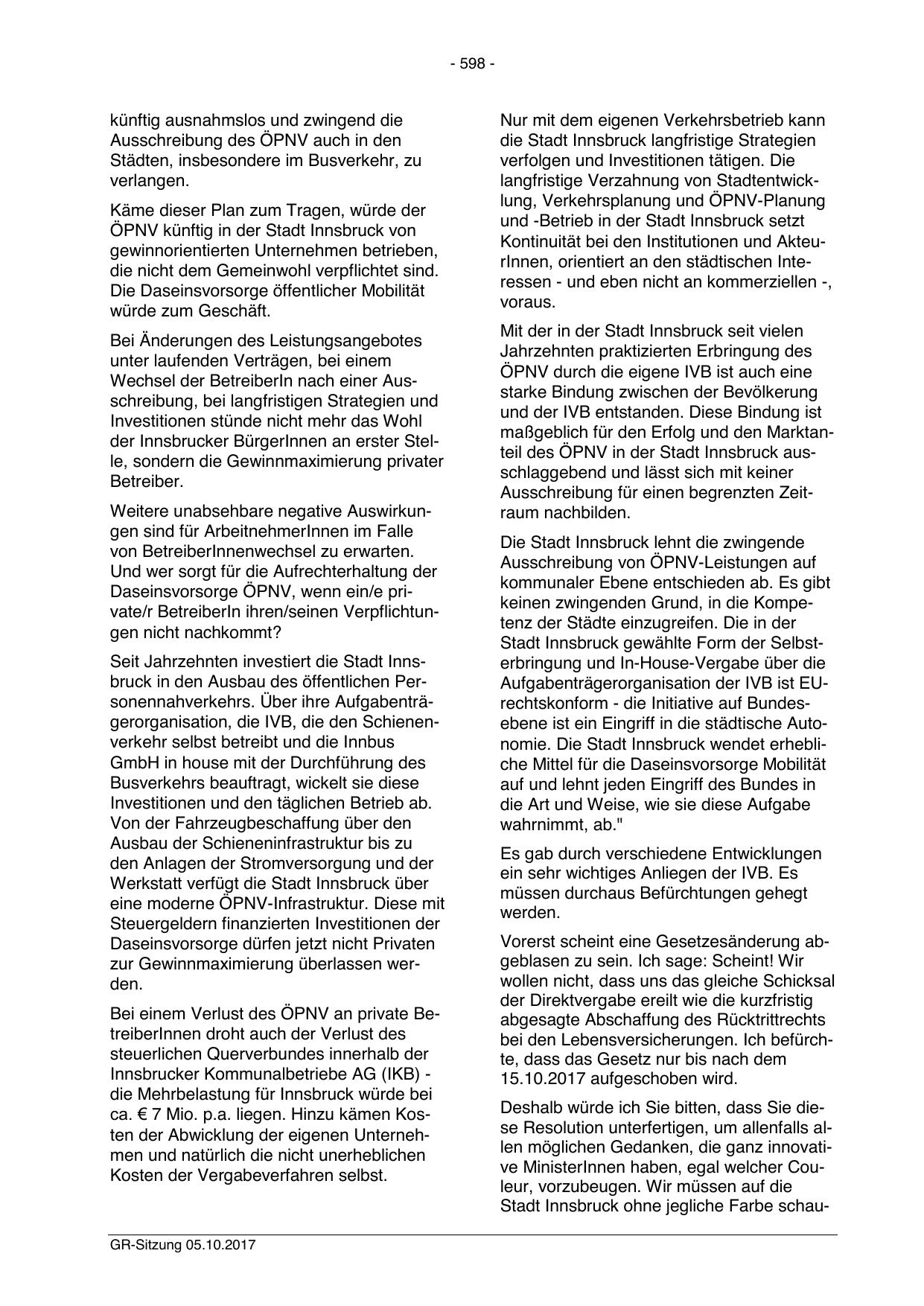 Aufgabenträgerorganisation der IVB ist EUrechtskonform - die Initiative auf Bundesebene ist ein Eingriff in die städtische Autonomie. Die Stadt Innsbruck wendet erhebliche Mittel für die Daseinsvorsorge Mobilität