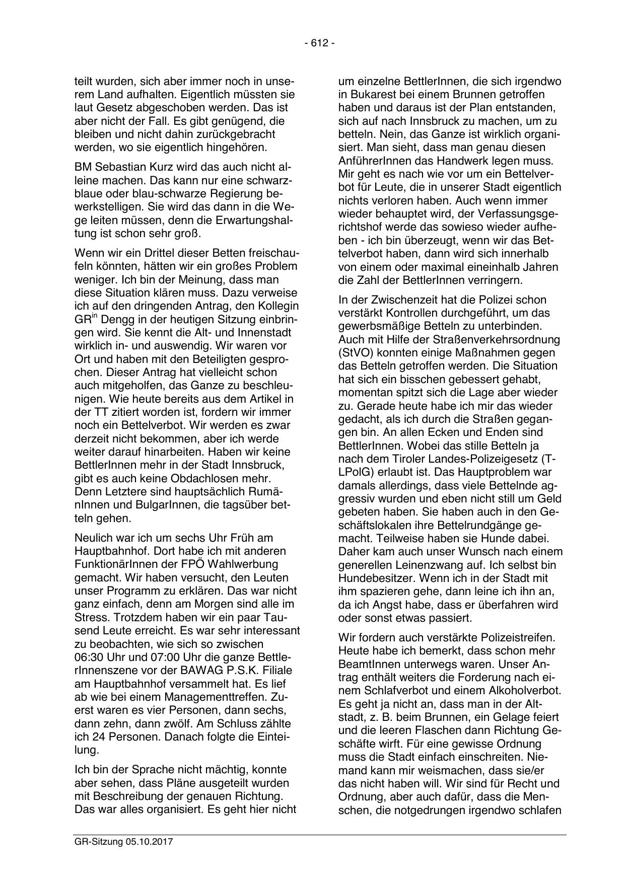 BeamtInnen unterwegs waren. Unser Antrag enthält weiters die Forderung nach einem Schlafverbot und einem Alkoholverbot.