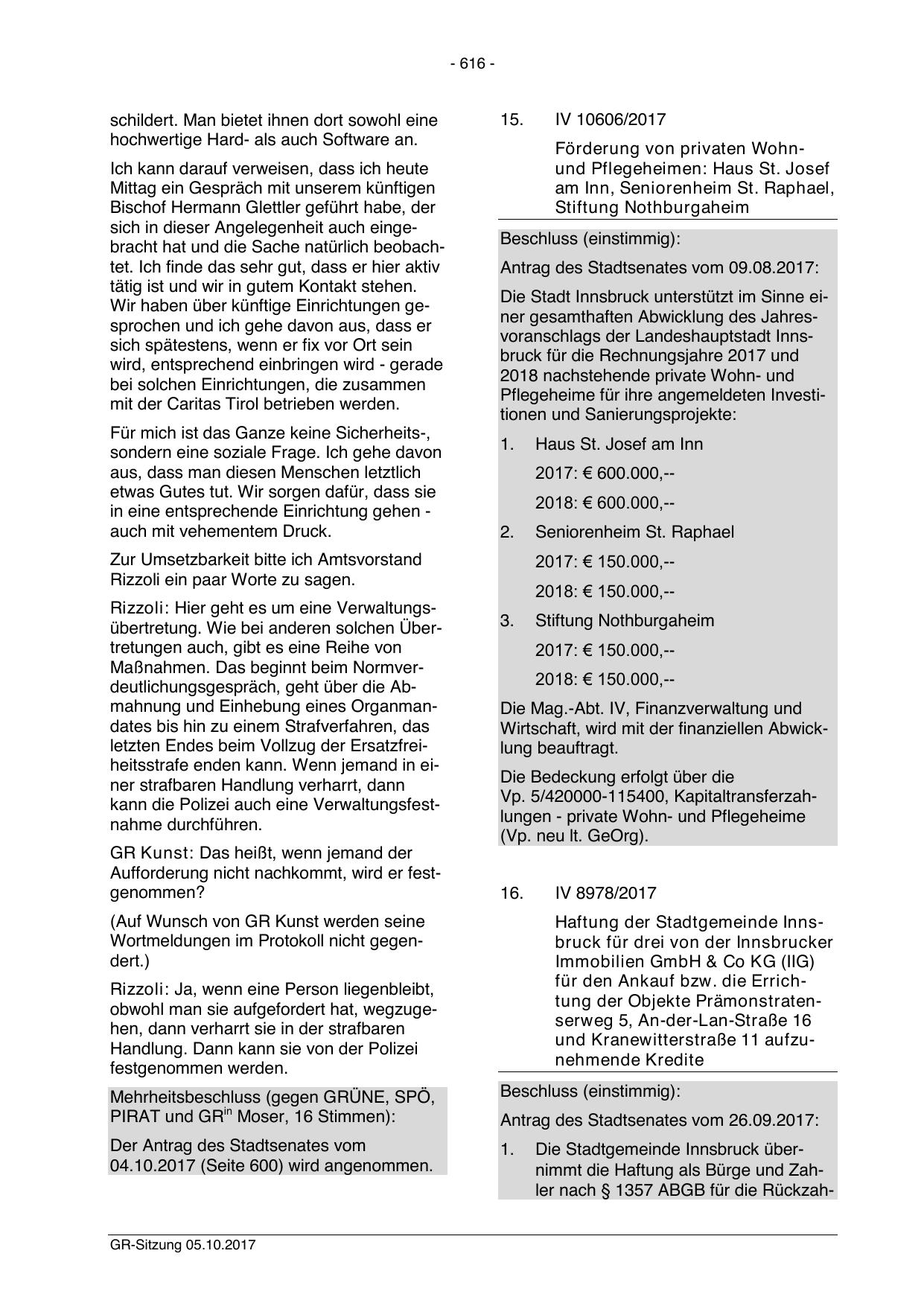 Die Stadt Innsbruck unterstützt im Sinne einer gesamthaften Abwicklung des Jahresvoranschlags der Landeshauptstadt Innsbruck für die Rechnungsjahre 2017 und