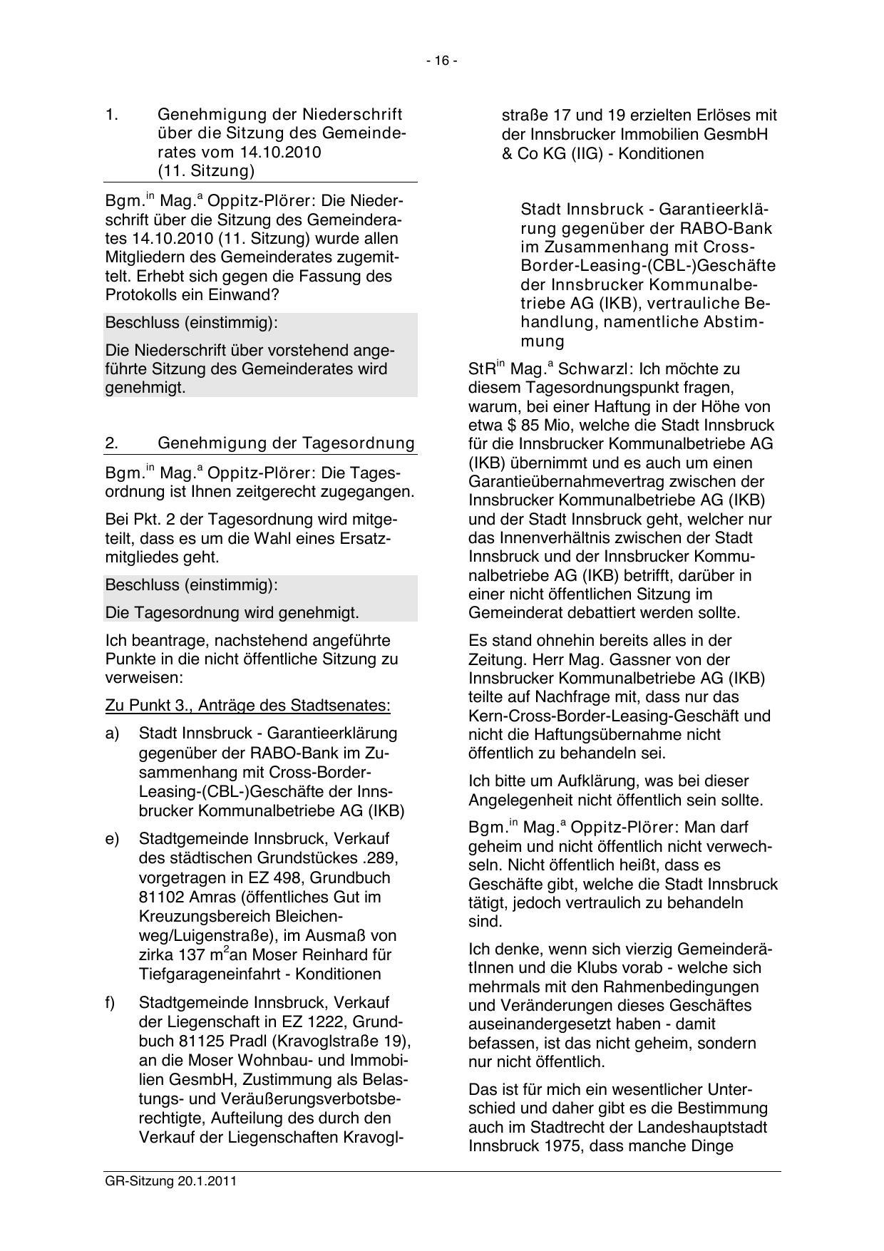 Bgm.in Mag.a Oppitz-Plörer: Die Niederschrift über die Sitzung des Gemeinderates 14.10.2010 (11. Sitzung) wurde allen