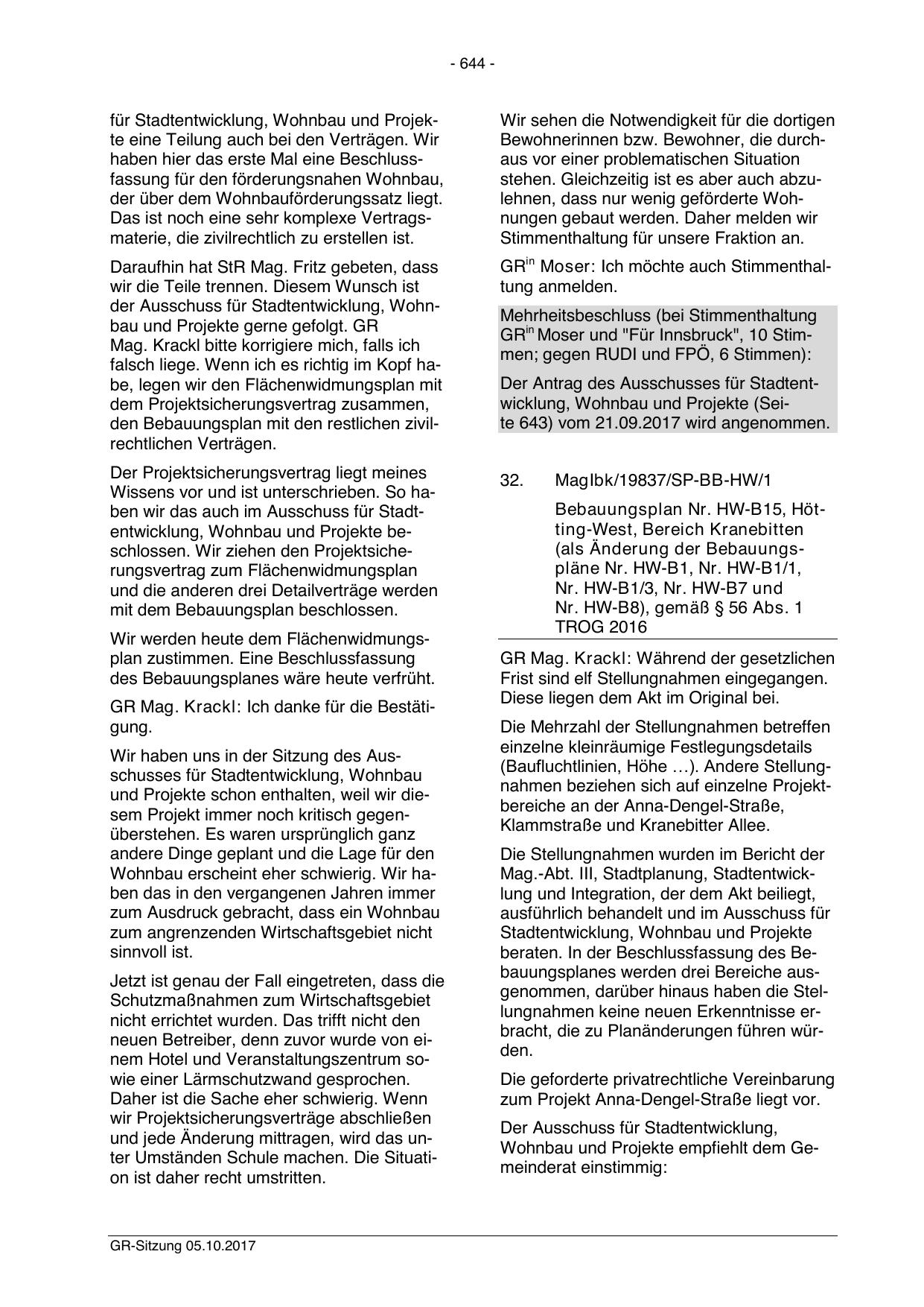 GRin Moser und "Für Innsbruck", 10 Stimmen; gegen RUDI und FPÖ, 6 Stimmen):