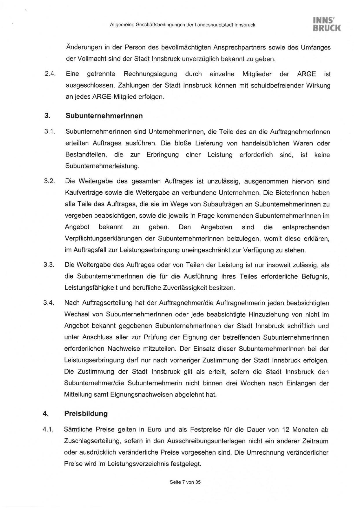 Angebot bekannt gegebenen Subunternehmerinnen der Stadt Innsbruck schriftlich und