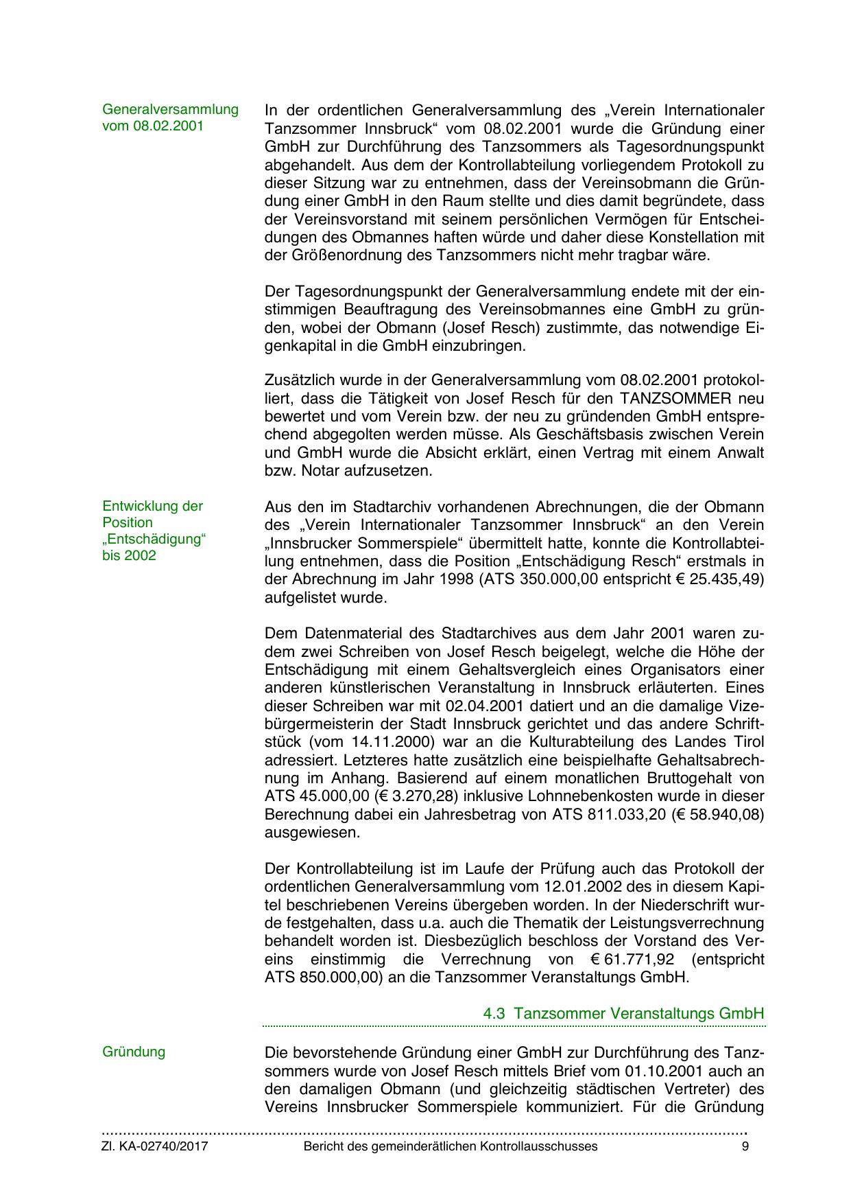 „Innsbrucker Sommerspiele“ übermittelt hatte, konnte die Kontrollabteilung entnehmen, dass die Position „Entschädigung Resch“ erstmals in