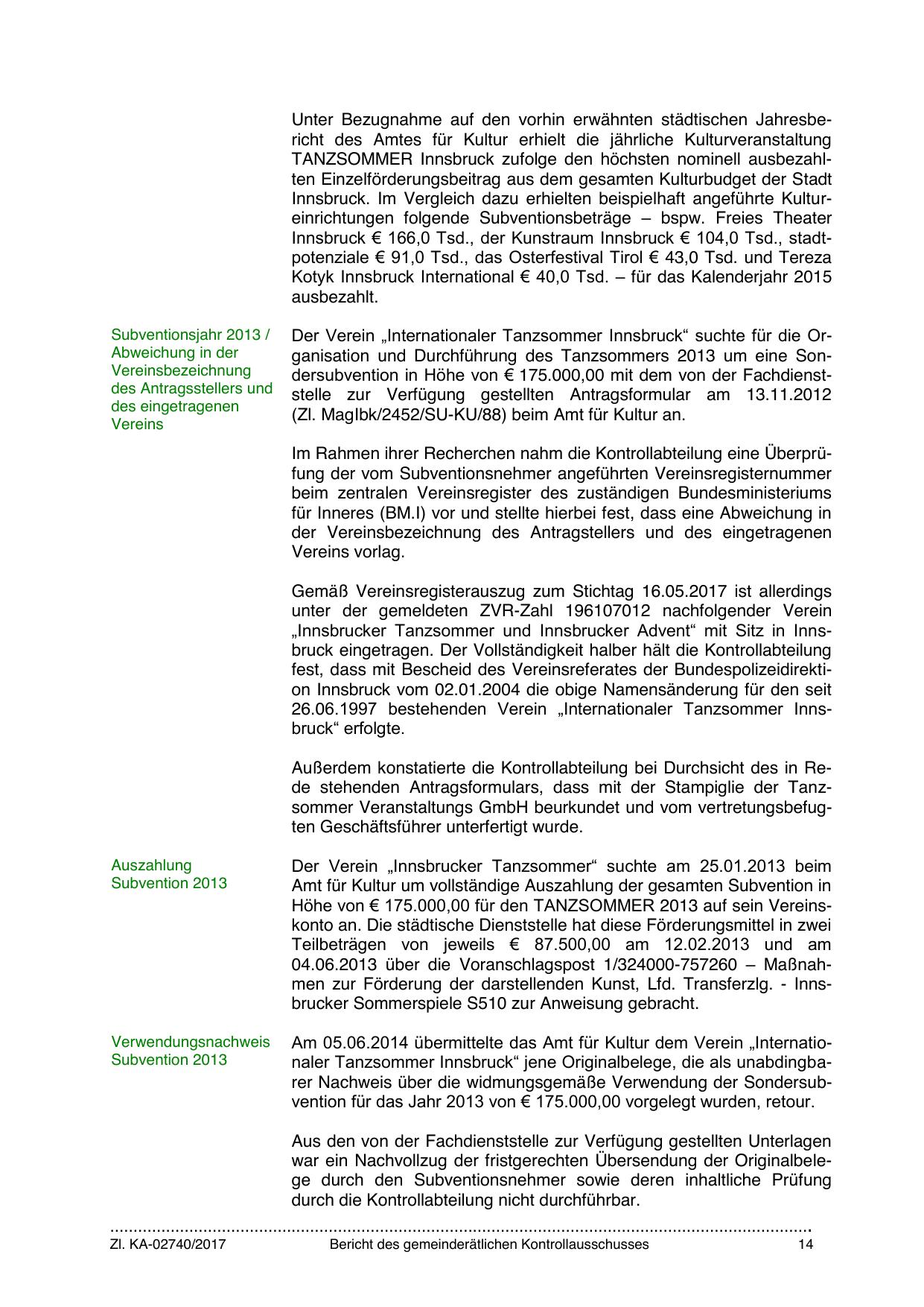 Am 05.06.2014 übermittelte das Amt für Kultur dem Verein „Internationaler Tanzsommer Innsbruck“ jene Originalbelege, die als unabdingbarer Nachweis über die widmungsgemäße Verwendung der Sondersubvention für das Jahr 2013 von € 175.000,00 vorgelegt wurden, retour.