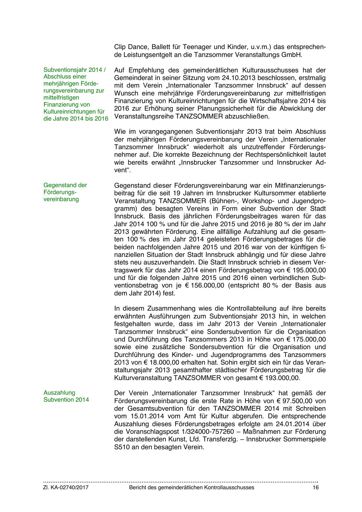 stets neu auszuverhandeln. Die Stadt Innsbruck schrieb in diesem Vertragswerk für das Jahr 2014 einen Förderungsbetrag von € 195.000,00