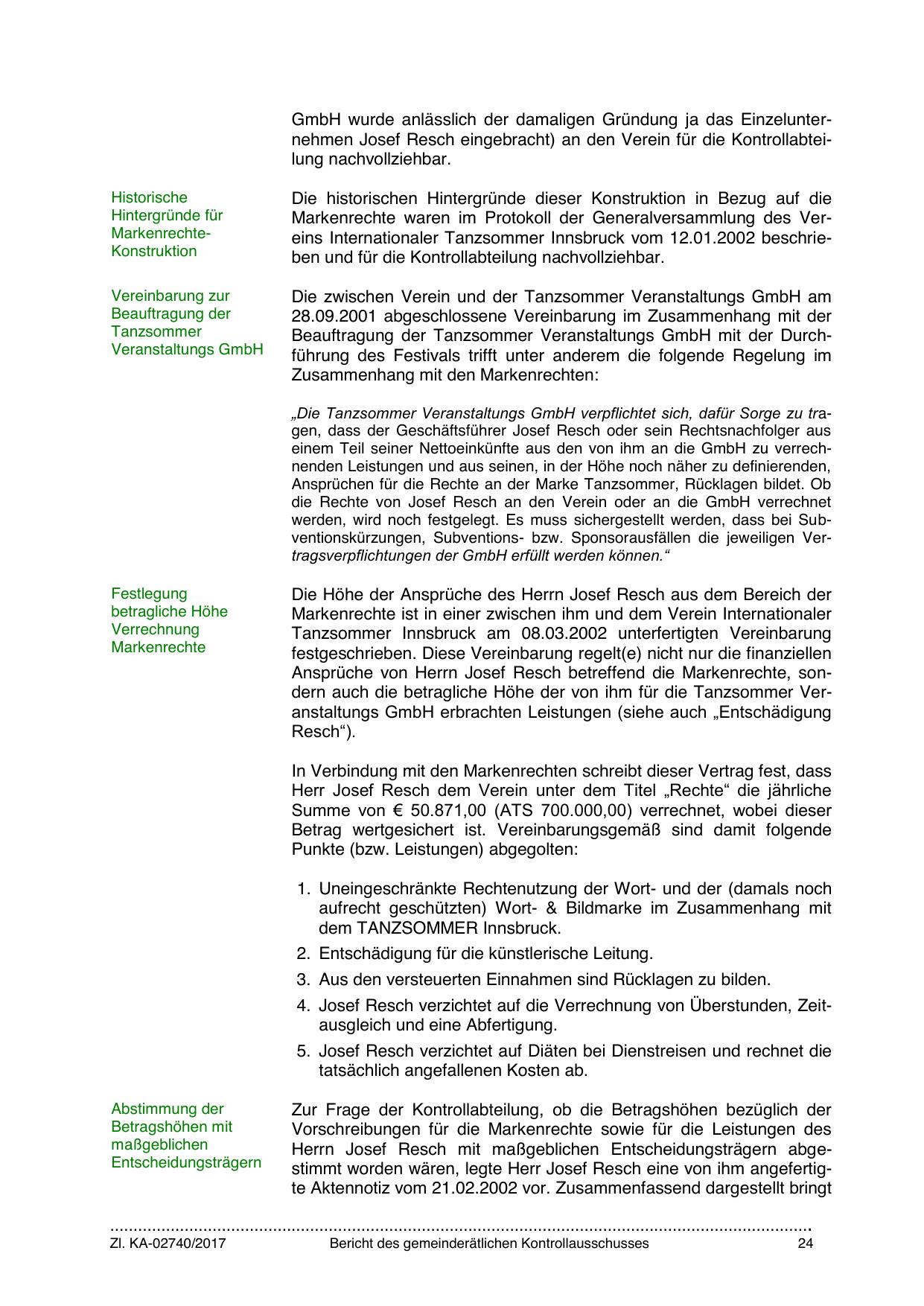 GmbH wurde anlässlich der damaligen Gründung ja das Einzelunternehmen Josef Resch eingebracht) an den Verein für die Kontrollabteilung nachvollziehbar.