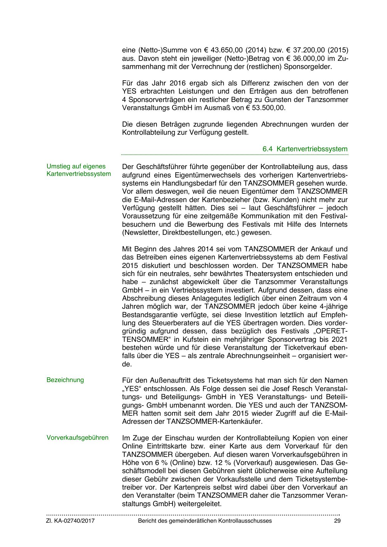 Bestandsgarantie verfügte, sei diese Investition letztlich auf Empfehlung des Steuerberaters auf die YES übertragen worden. Dies vordergründig aufgrund dessen, dass bezüglich des Festivals „OPERETTENSOMMER“ in Kufstein ein mehrjähriger Sponsorvertrag bis 2021