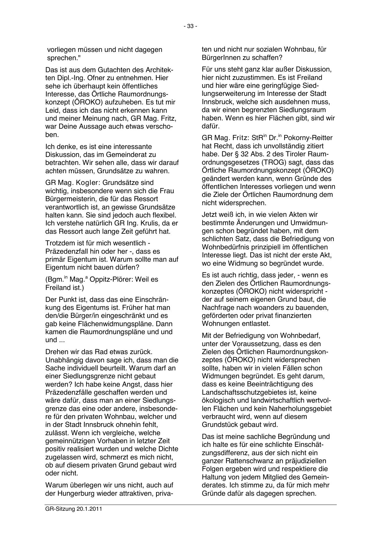 der Hungerburg wieder attraktiven, privaGR-Sitzung 20.1.2011