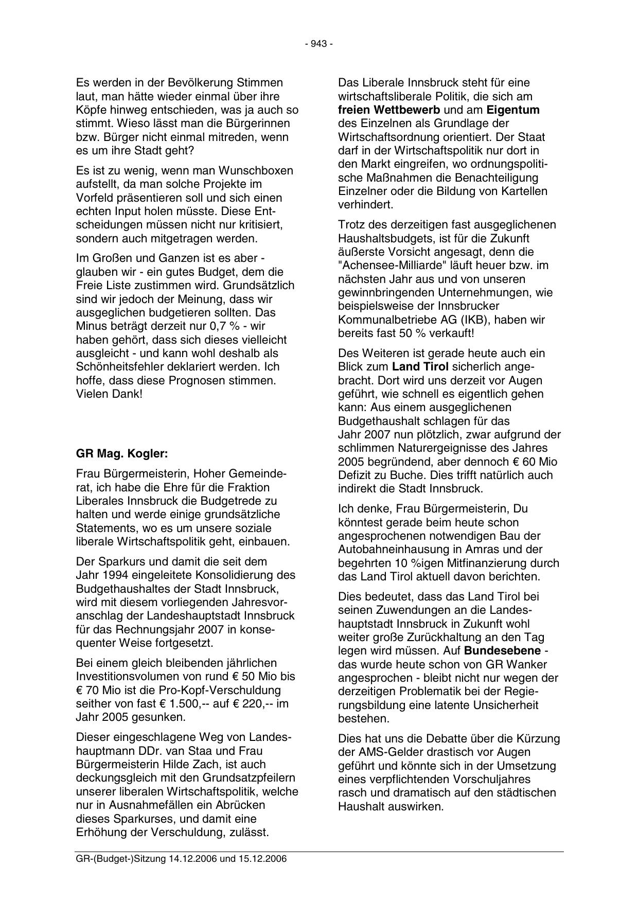 GR-(Budget-)Sitzung 14.12.2006 und 15.12.2006