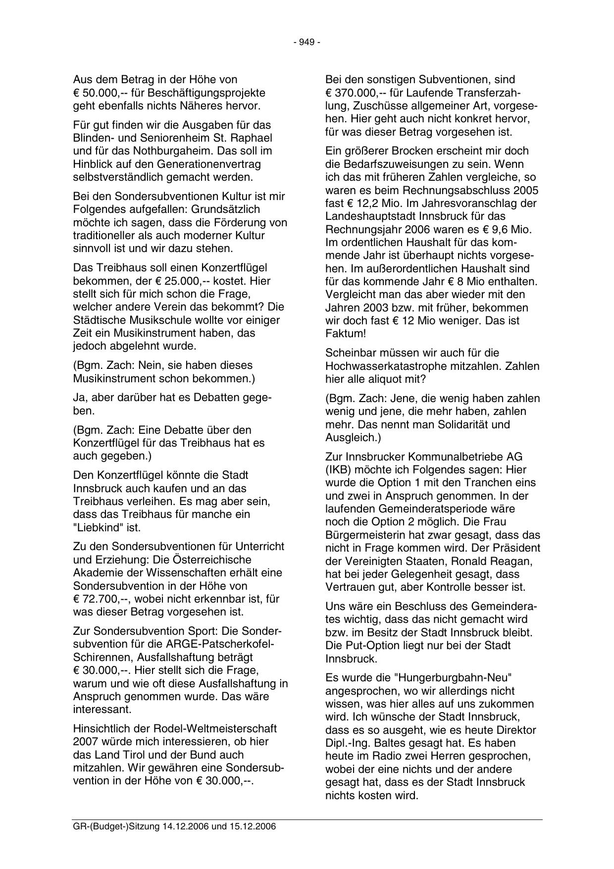GR-(Budget-)Sitzung 14.12.2006 und 15.12.2006