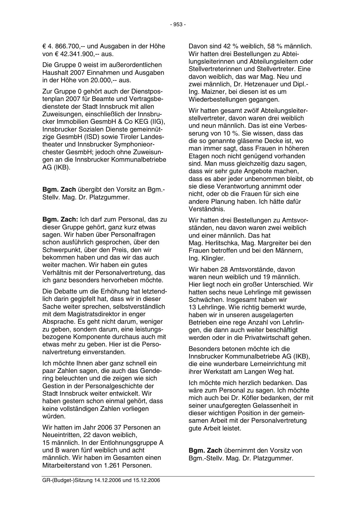 Zur Gruppe 0 gehört auch der Dienstpostenplan 2007 für Beamte und Vertragsbedienstete der Stadt Innsbruck mit allen