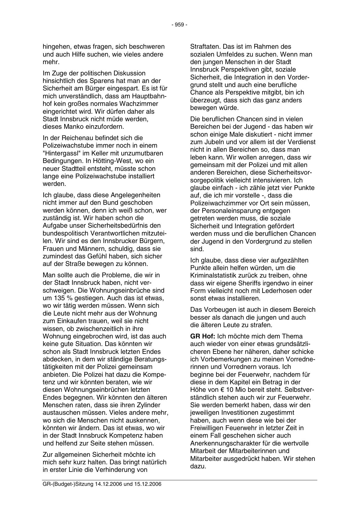GR-(Budget-)Sitzung 14.12.2006 und 15.12.2006