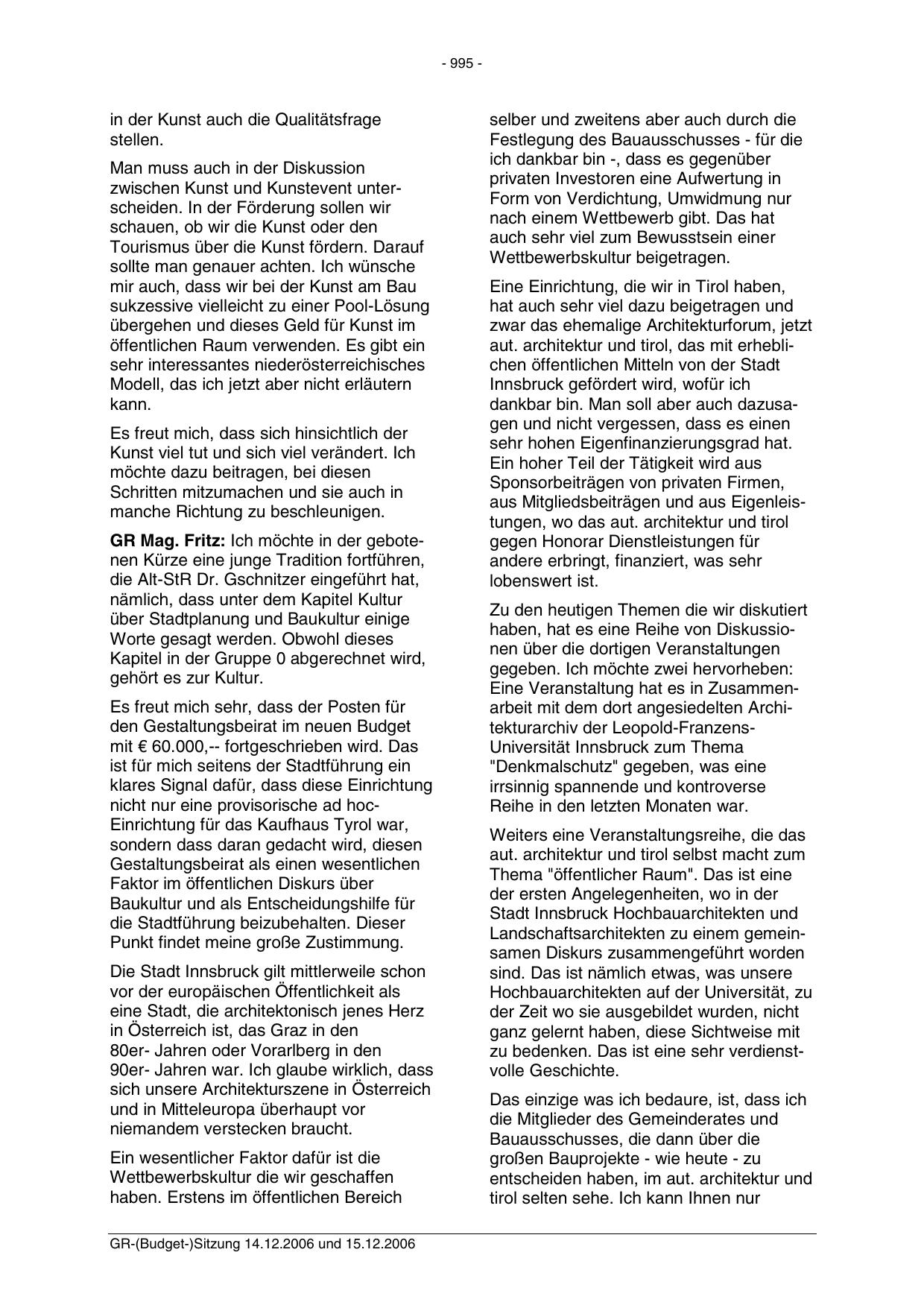 GR-(Budget-)Sitzung 14.12.2006 und 15.12.2006