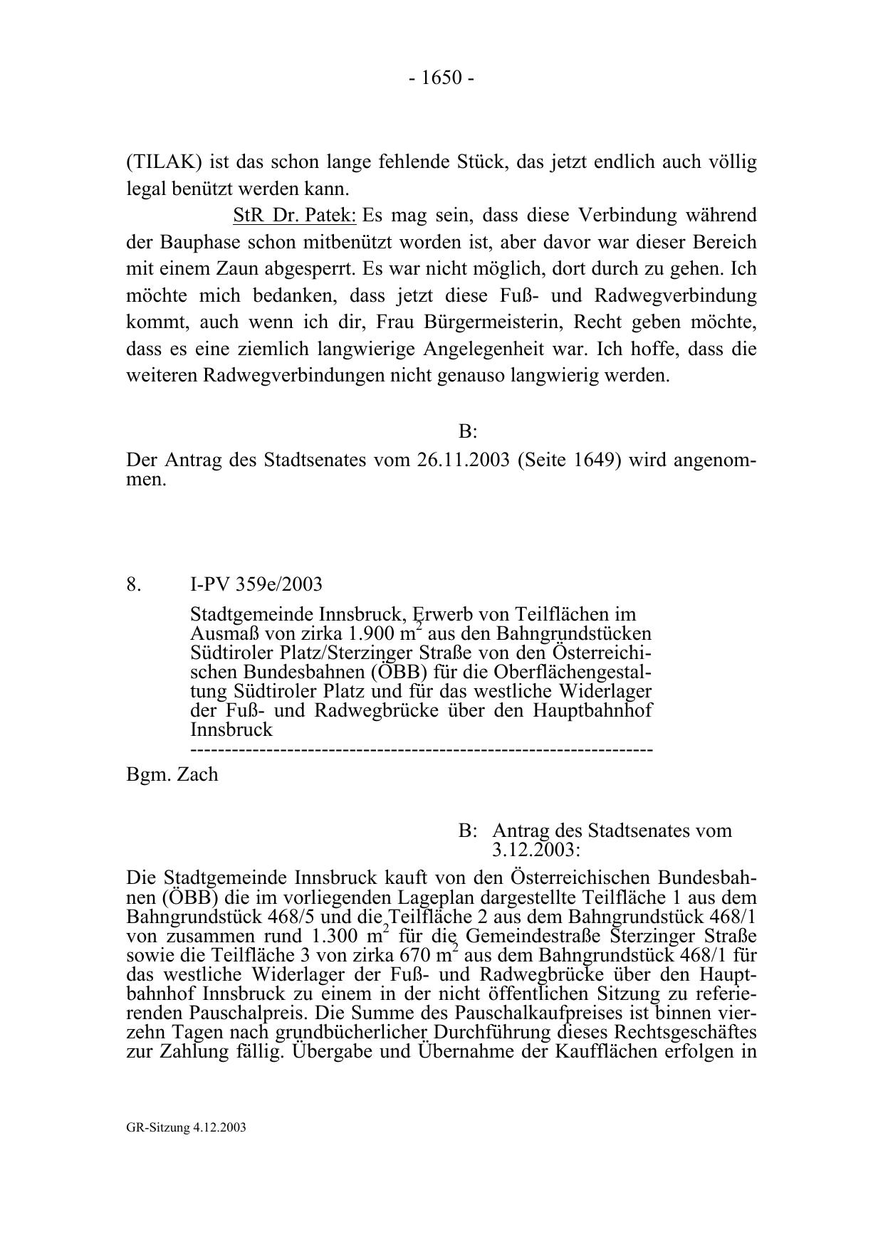Der Antrag des Stadtsenates vom 26.11.2003 (Seite 1649) wird angenommen.