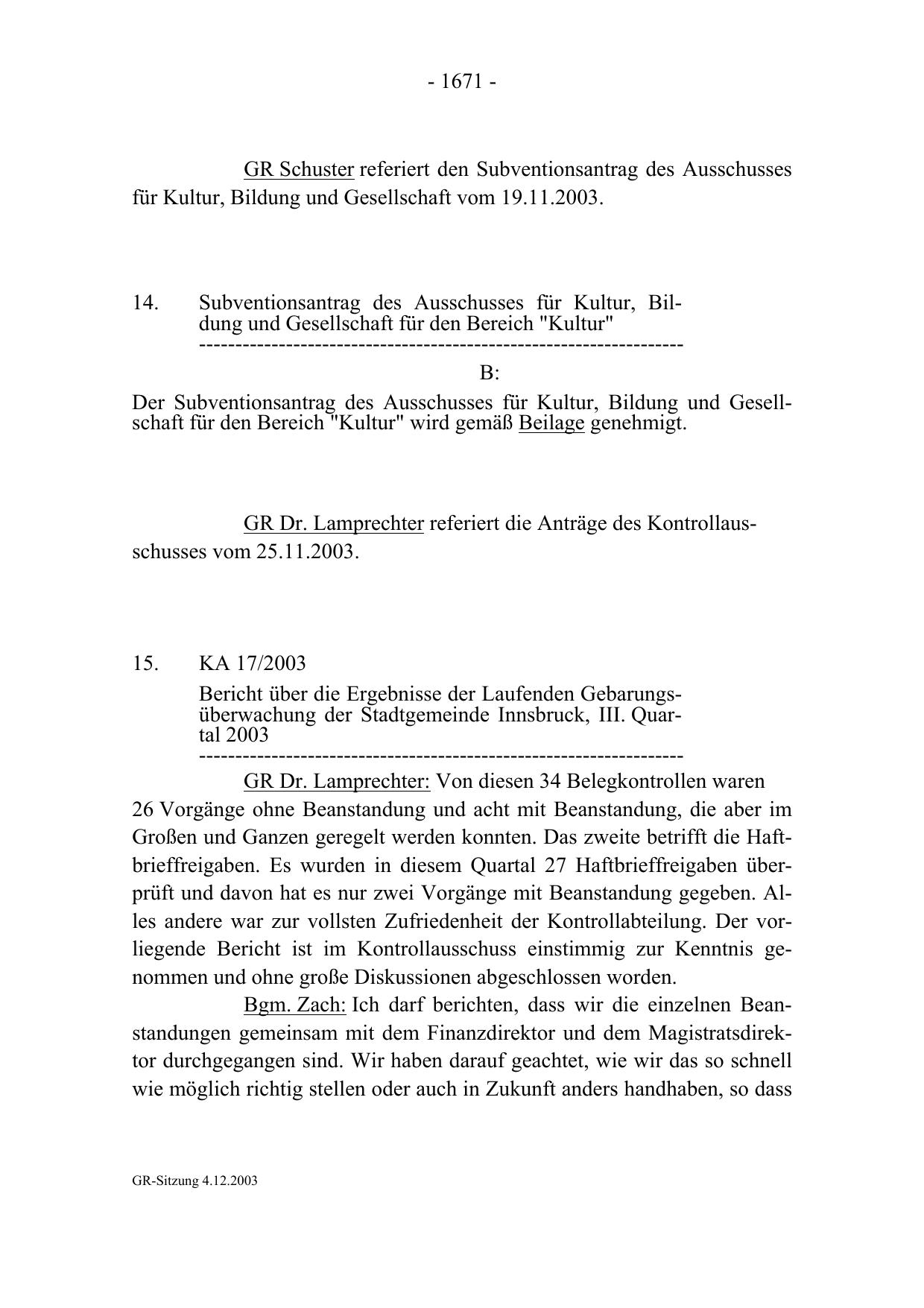 GR Dr. Lamprechter referiert die Anträge des Kontrollausschusses vom 25.11.2003.
