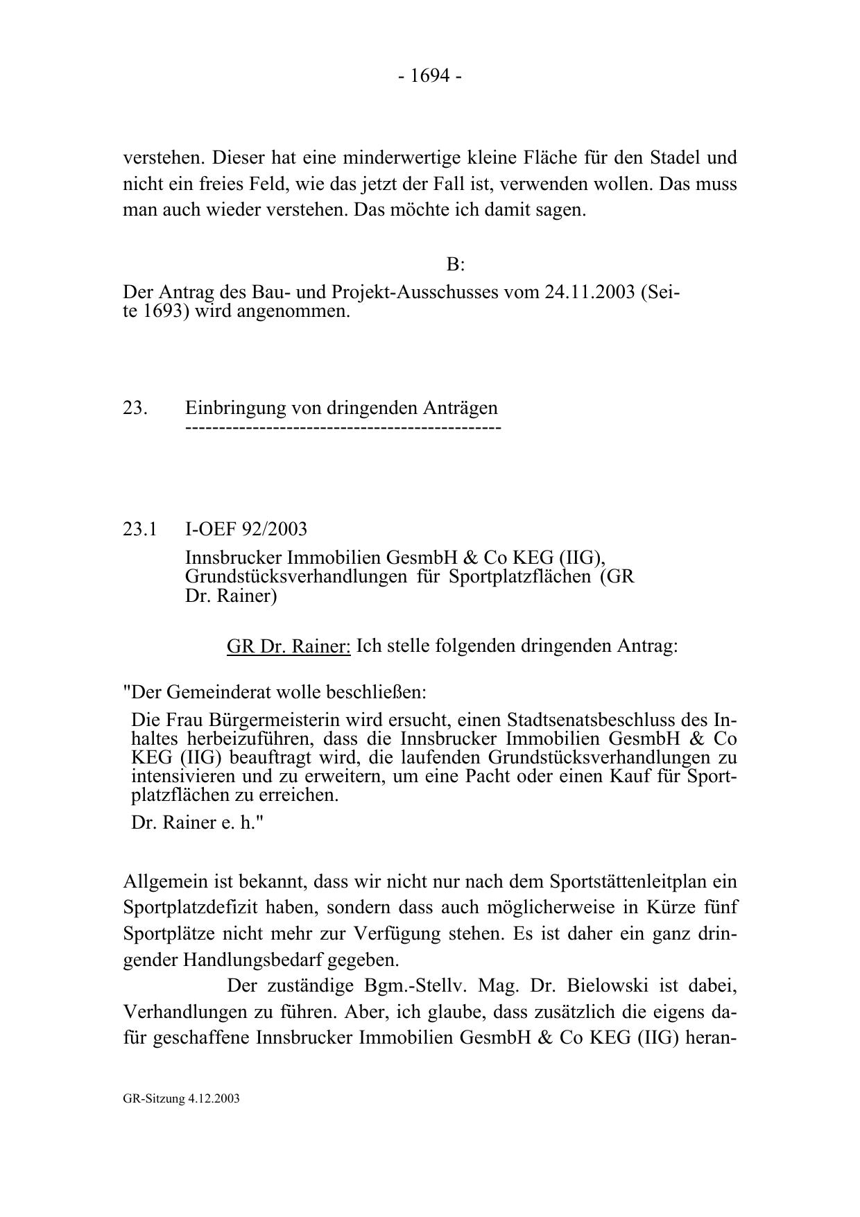 Verhandlungen zu führen. Aber, ich glaube, dass zusätzlich die eigens dafür geschaffene Innsbrucker Immobilien GesmbH & Co KEG (IIG) heranGR-Sitzung 4.12.2003