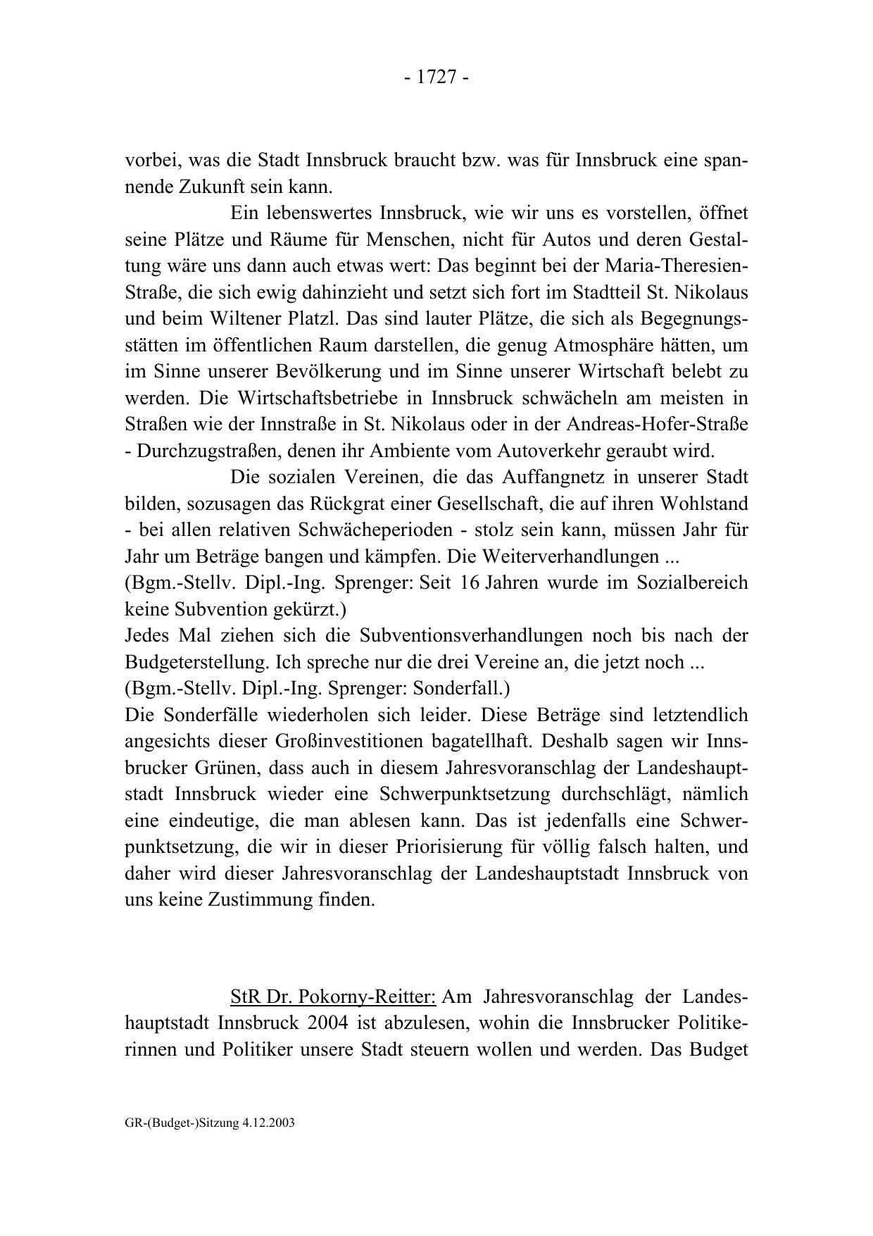 StR Dr. Pokorny-Reitter: Am Jahresvoranschlag der Landeshauptstadt Innsbruck 2004 ist abzulesen, wohin die Innsbrucker Politikerinnen und Politiker unsere Stadt steuern wollen und werden. Das Budget
