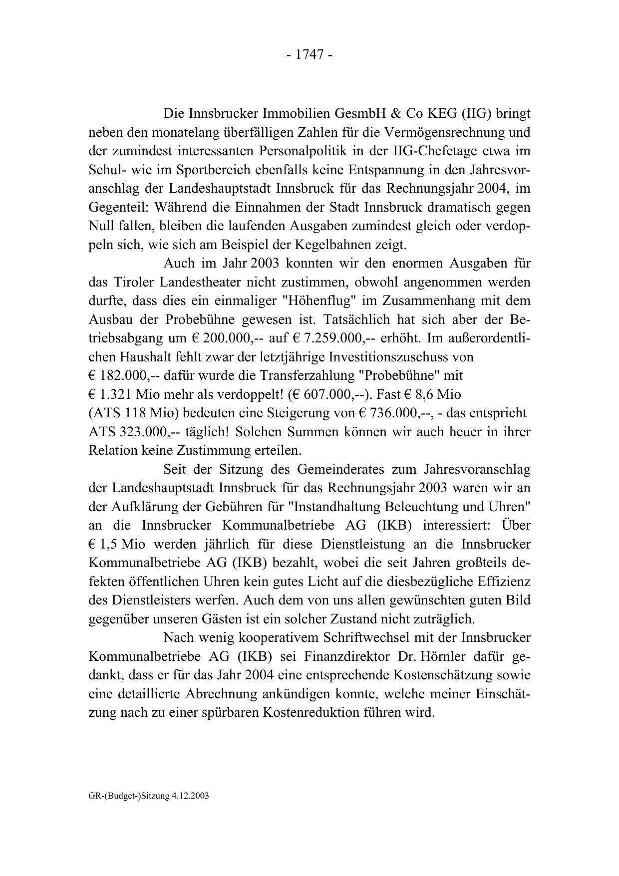 der Landeshauptstadt Innsbruck für das Rechnungsjahr 2003 waren wir an