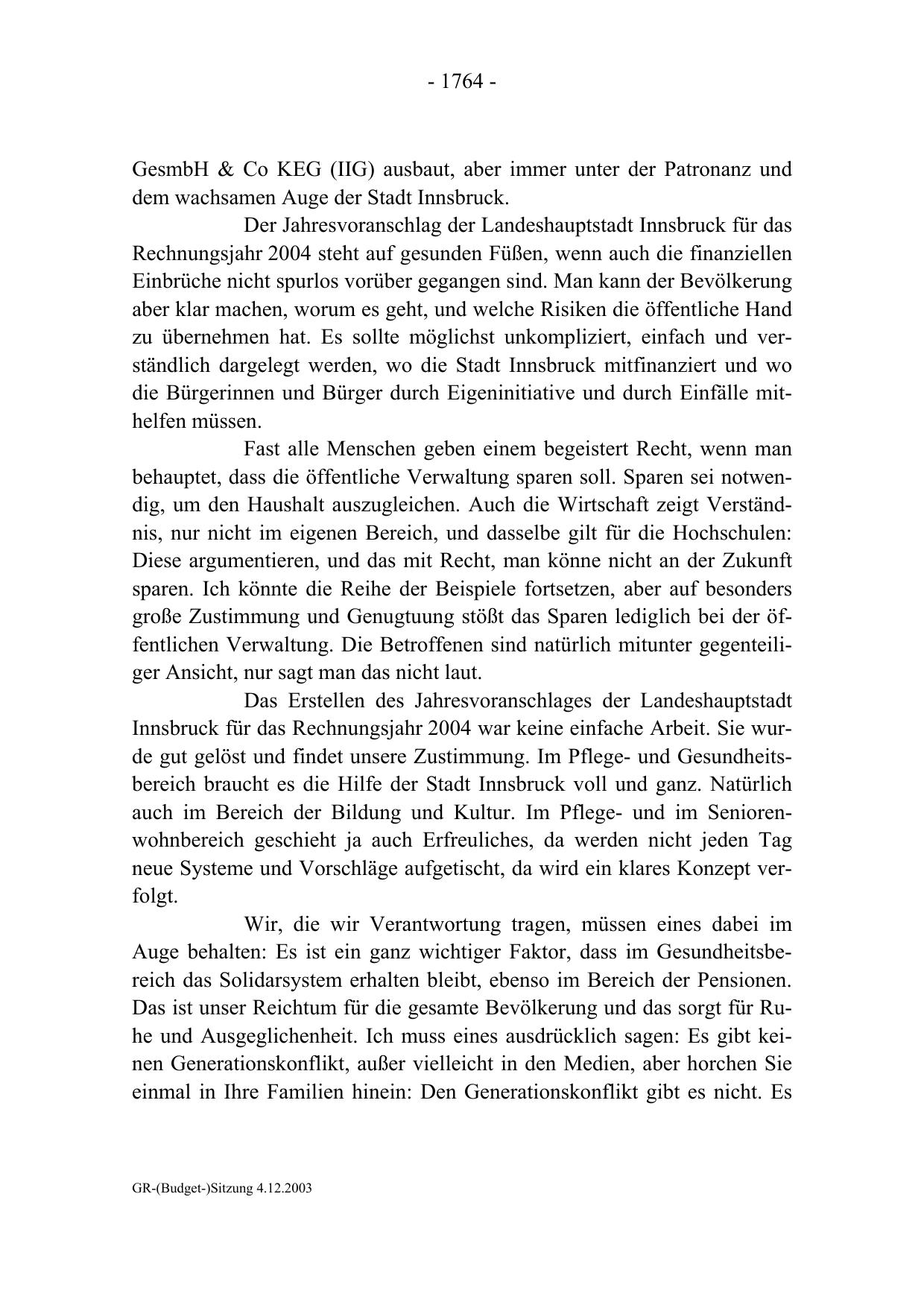 Innsbruck für das Rechnungsjahr 2004 war keine einfache Arbeit. Sie wurde gut gelöst und findet unsere Zustimmung. Im Pflege- und Gesundheitsbereich braucht es die Hilfe der Stadt Innsbruck voll und ganz. Natürlich